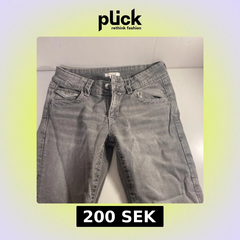 Snygga grå jeans från Gina Tricot i storlek 170. Modellen har klassisk femficksdesign med extra detaljer som broderad bakficka och dekorativa knappar. Jeansen är flare och är tillverkade i mjukt denimtyg för en bekväm känsla.