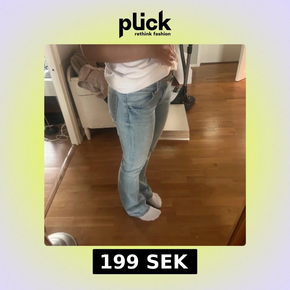 Säljer ett par ljusblå jeans med bootcut-modell och låg midja. Jeansen har klassisk femficksdesign och är tillverkade i mjukt denimtyg. Perfekta för dig som gillar en avslappnad men ändå snygg stil.