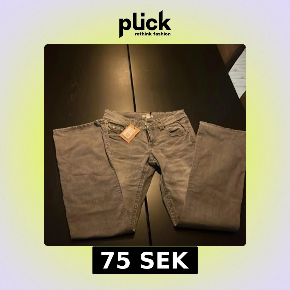 Snygga grå jeansbyxor köpta från Sellpy med klassisk femficksdesign, bälteshällor och dragkedja. Jeansen har bootcut ben och dubbla knappar i midjan. Perfekta för dig som gillar en stilren och enkel look. Köpta från Sellpy men passade inte💕