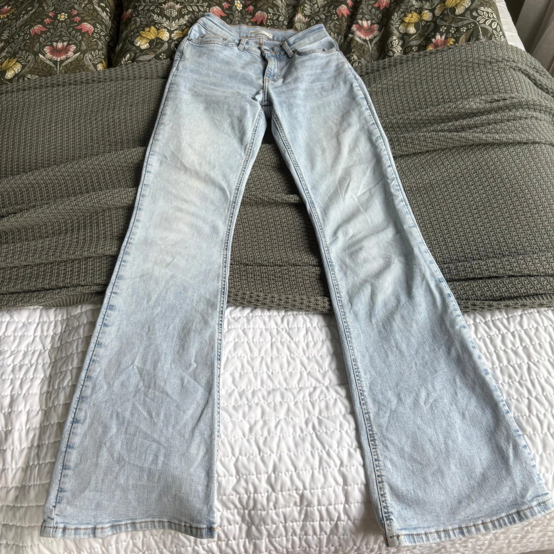 Snygga ljusblå jeans med bootcut-modell. Jeansen har låg midja och är tillverkade i mjukt denimtyg. Passar mig perfekt i längden, jag är 163 cm. Den är i mycket bra skick och endast använda några få gånger och jag säljer pågrund av att jag har ett par exakt likadana.💞