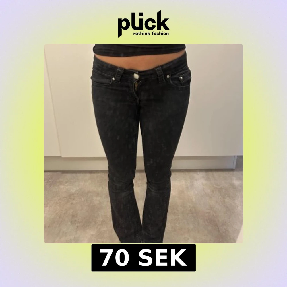 Snygga svarta jeans från Gina Tricot i modellen Perfect Jeans. De har bootcut-ben, klassiska fem fickor och silverfärgade knappar. Jeansen är i stretchigt denim och har låg midja för en cool look.
