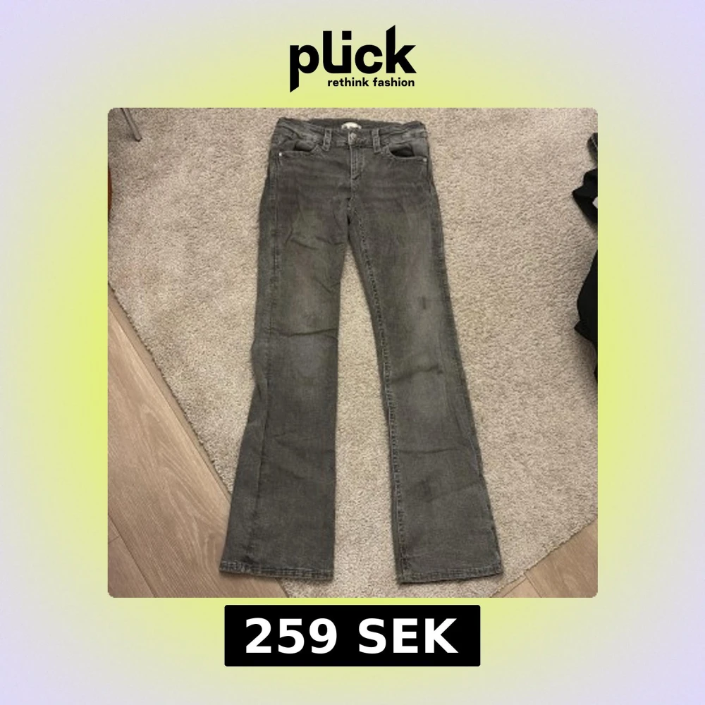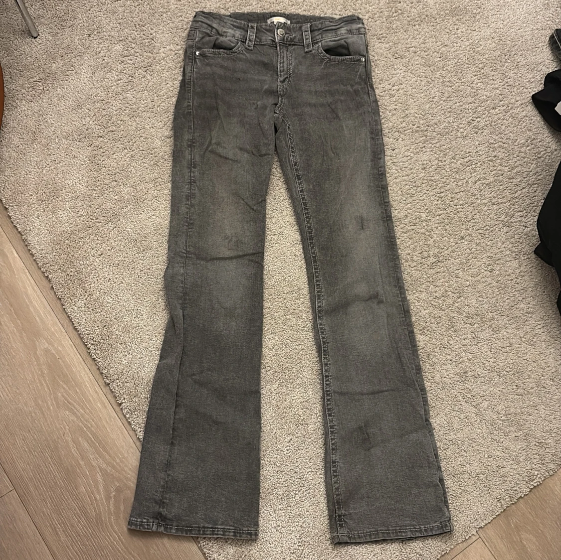 Storlek 170 Går o diskutera pris Snygga grå jeans med raka ben och coola broderade detaljer på bakfickorna. Klassisk femficksmodell och normal passform. Jeansen har en lite tvättad look och är tillverkade i mjukt jeanstyg.