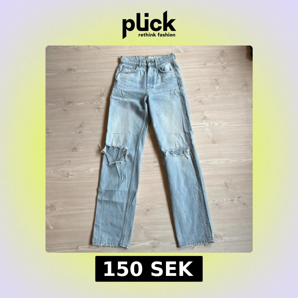 Ljusblå högmidjade jeans med raka ben och slitningar över knäna.