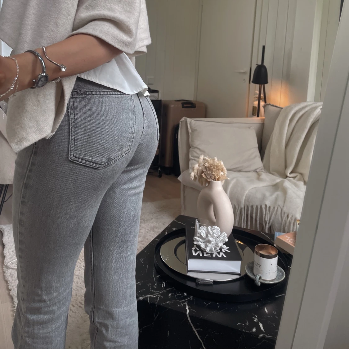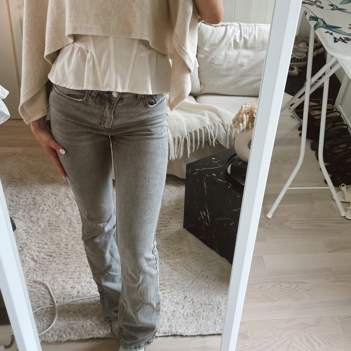 Säljer ett par snygga grå jeans med bootcut-modell. Jeansen har klassisk femficksdesign, dragkedja och knapp framtill. Materialet är jeans i en ljusgrå tvätt som ger en fräsch och trendig look. Perfekta för dig som gillar en stilren och avslappnad vibe.