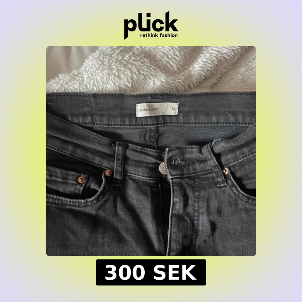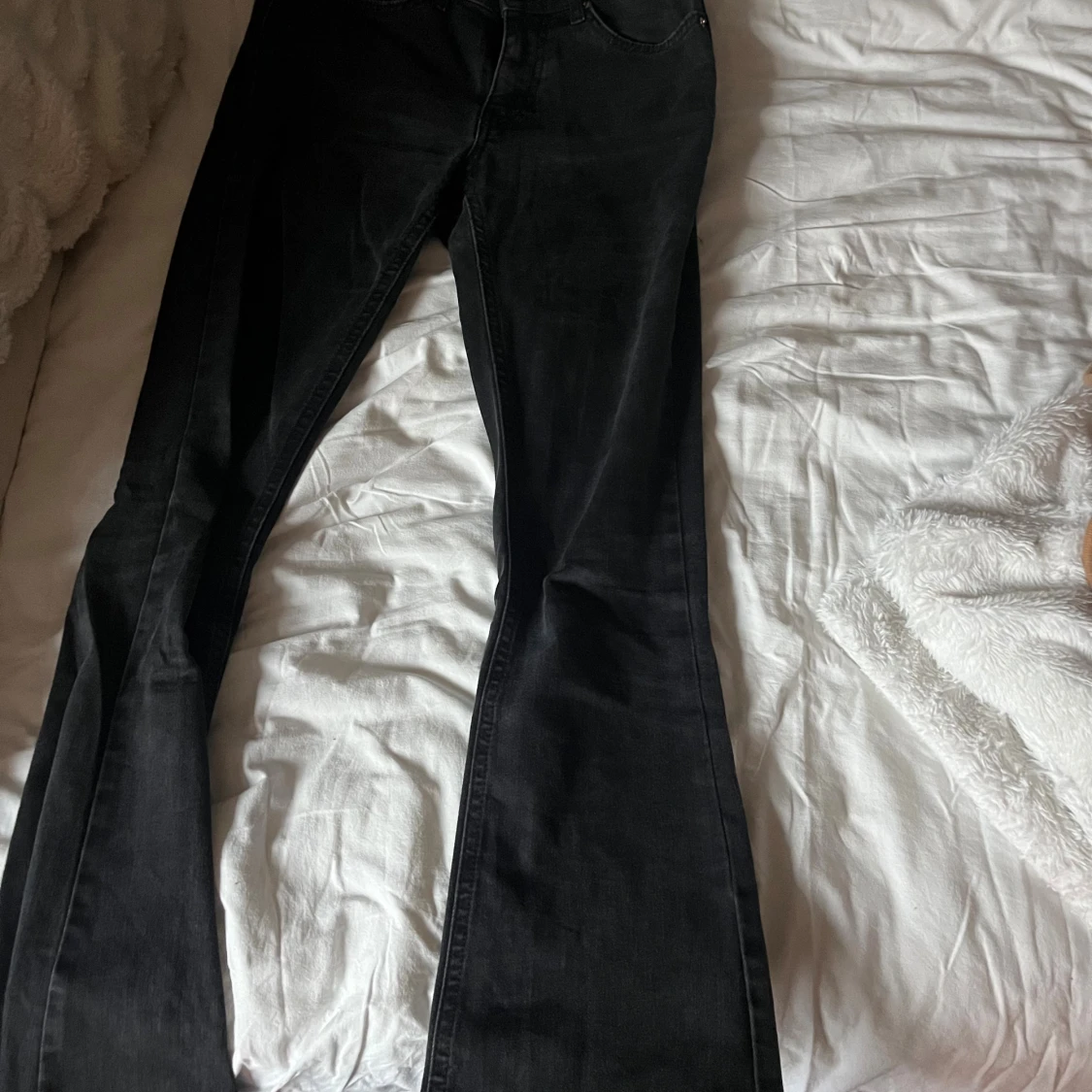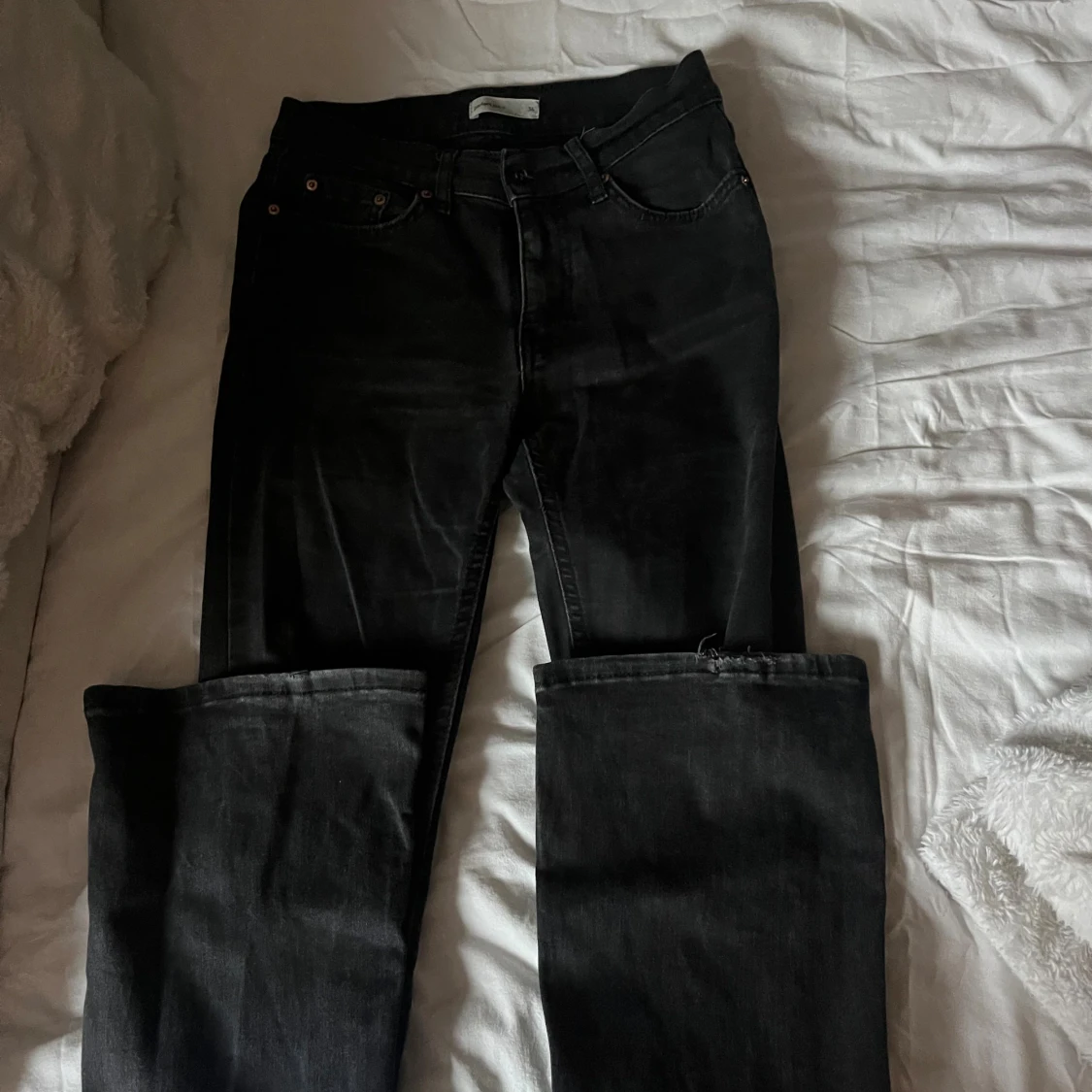 Svarta jeans från Gina Tricot i sorlex 34 (XS) . Byxorna har bootcut-ben och normal passform, med snygga kopparfärgade nitar och knapp. Tillverkade i stretchig denim för extra komfort. Använda men i fint skick, har en liten slitning längst ner på byxorna vid hälen.