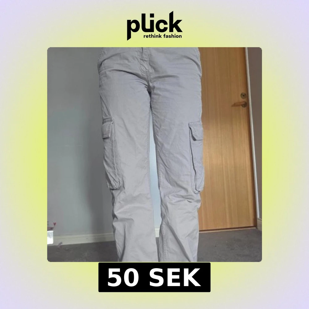 Säljer ett par grå cargobyxor med flera praktiska fickor på sidorna. Byxorna har en avslappnad passform och är perfekta för en casual look. De är tillverkade i ett slitstarkt material och har en klassisk design.