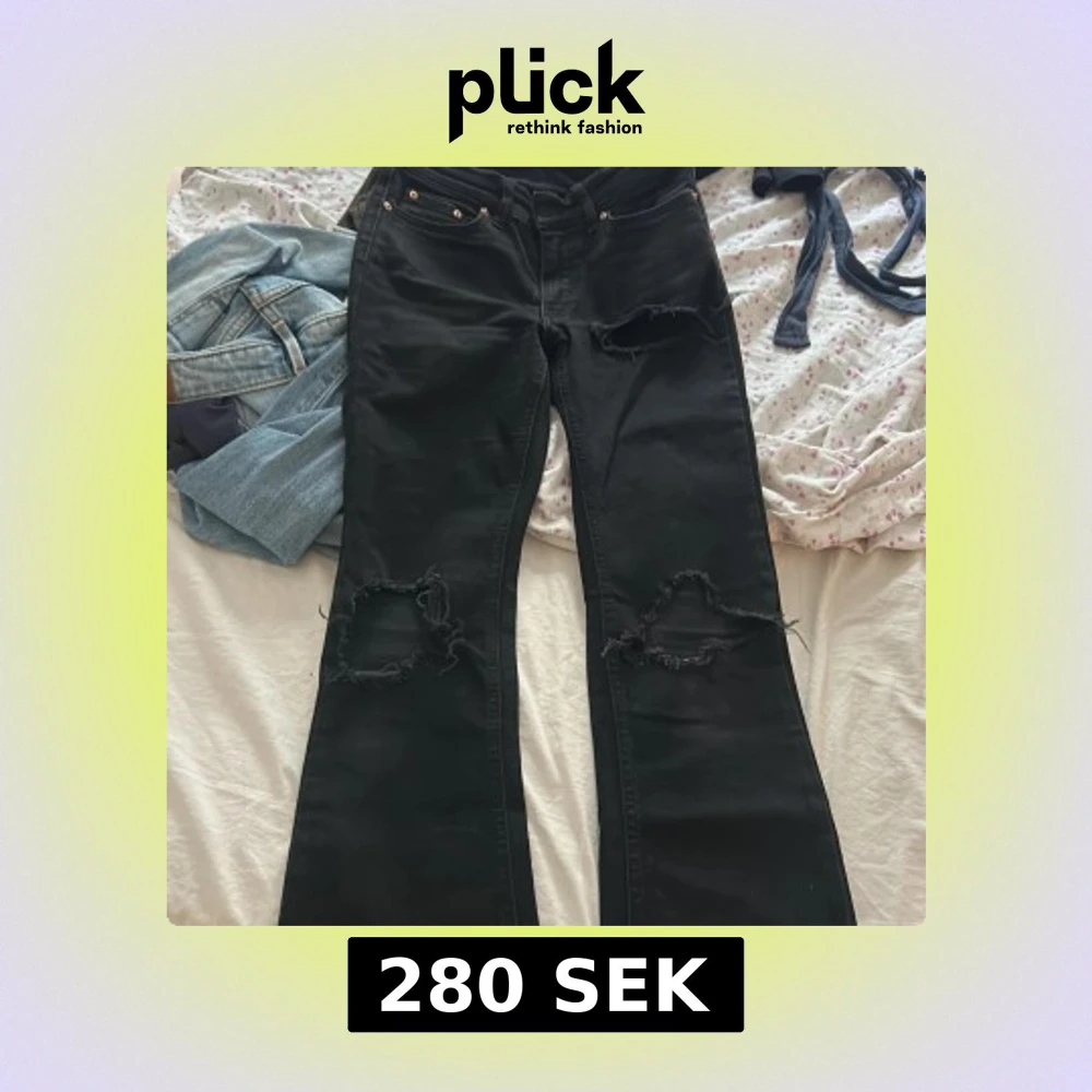 Säljer ett par svarta jeans med bootcut passform och stora slitningar vid knäna. Jeansen har låg midja och klassisk femficksdesign. Materialet är jeans och de har en riktigt edgy vibe, perfekta för dig som gillar en tuffare stil.