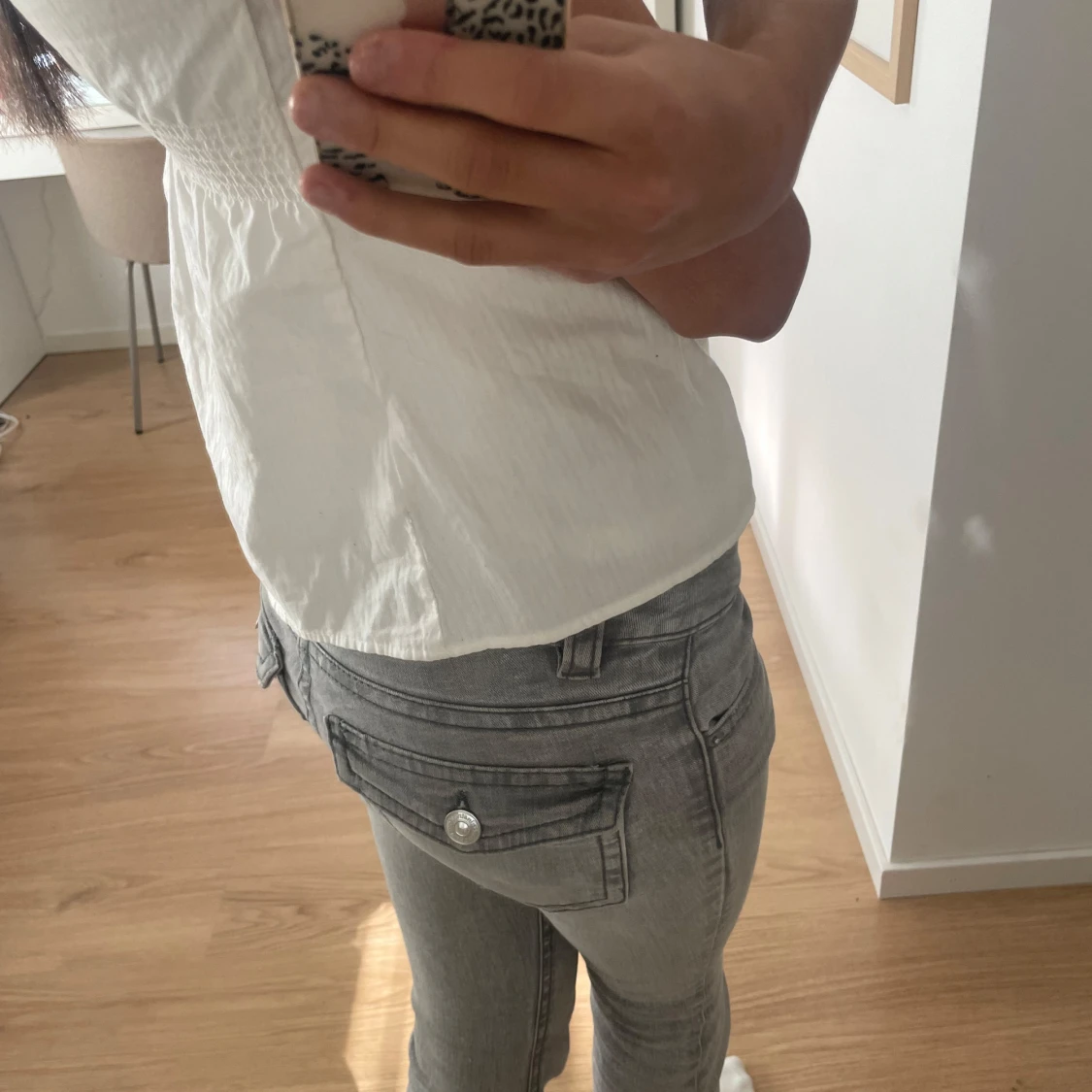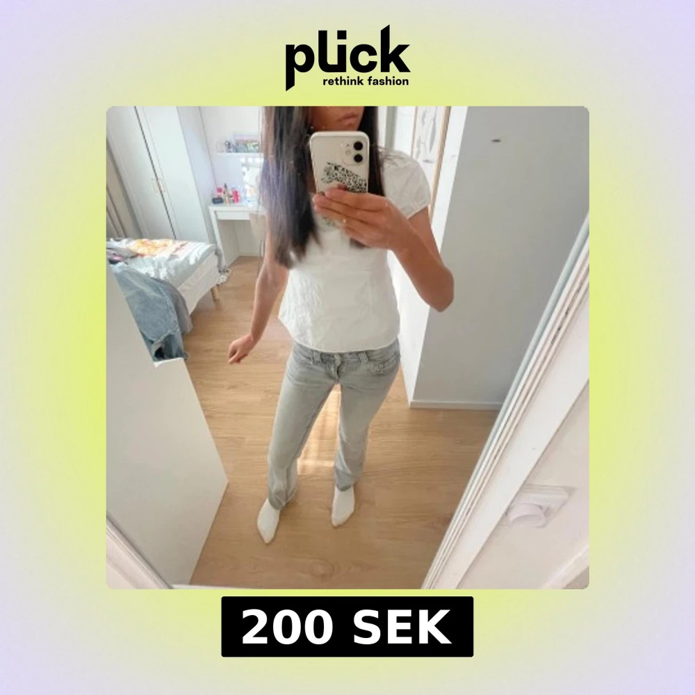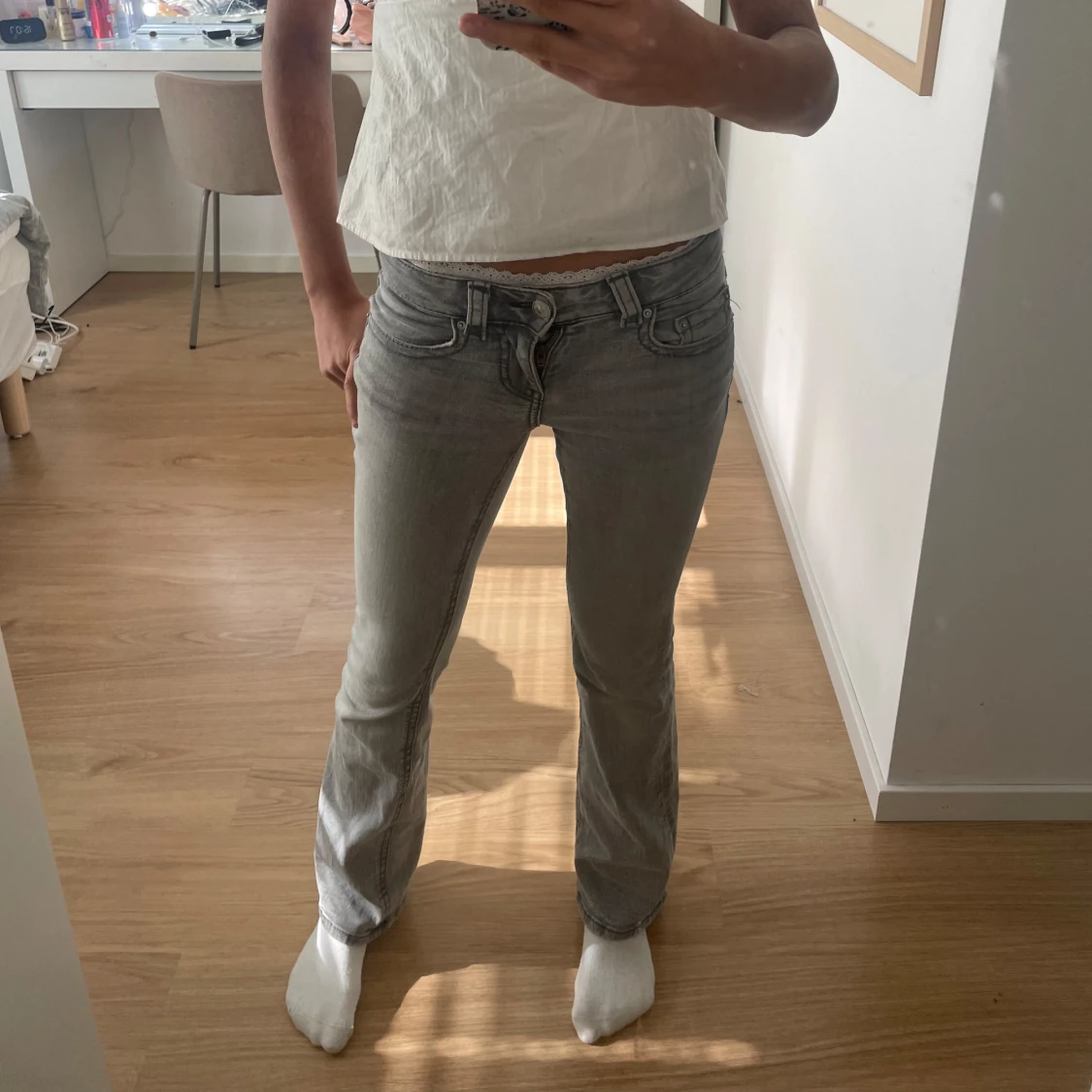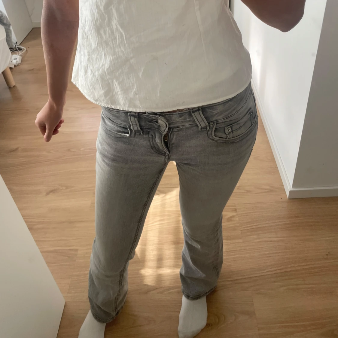 Ljusgrå low waist bootcut jeans med en snygg fick detalj med knappar🥰säljer pga att de är lite lite för korta i benen för mig som är ca 170, har långa ben.