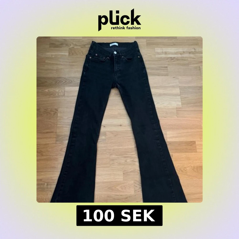Säljer ett par svarta bootcut jeans från gina tricot i storlek 34. Jeansen har klassisk femficksdesign, låg midja och är tillverkade i ett stretchigt denimtyg som sitter snyggt. Perfekta för dig som gillar en tidlös och trendig look.