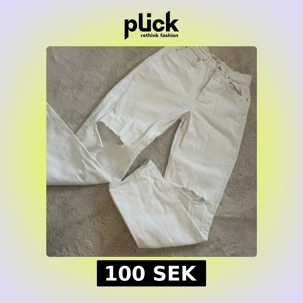 Vita jeans från Gina Tricot med raka ben och slitna detaljer vid båda knäna. Klassisk femficksmodell i kraftig denim med snygga silverfärgade knappar.
