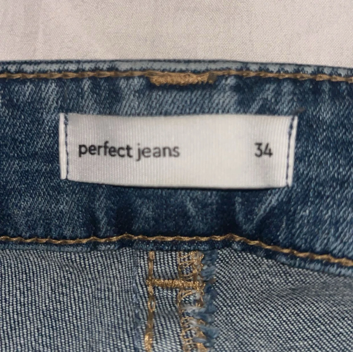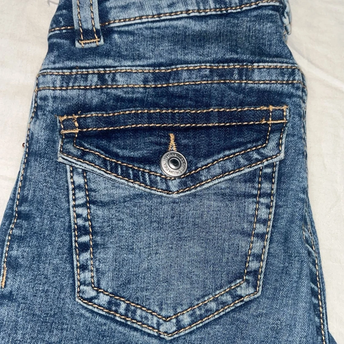 Blå jeans från Ginatricot med detaljer på bakfickorna, bootcut jeans. Använts en del men fortfarande bra skick, inget trasigt