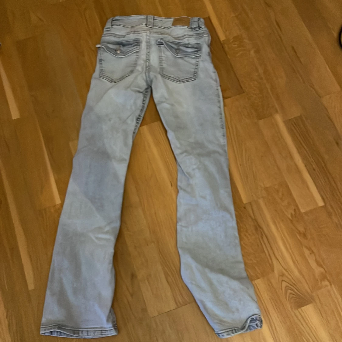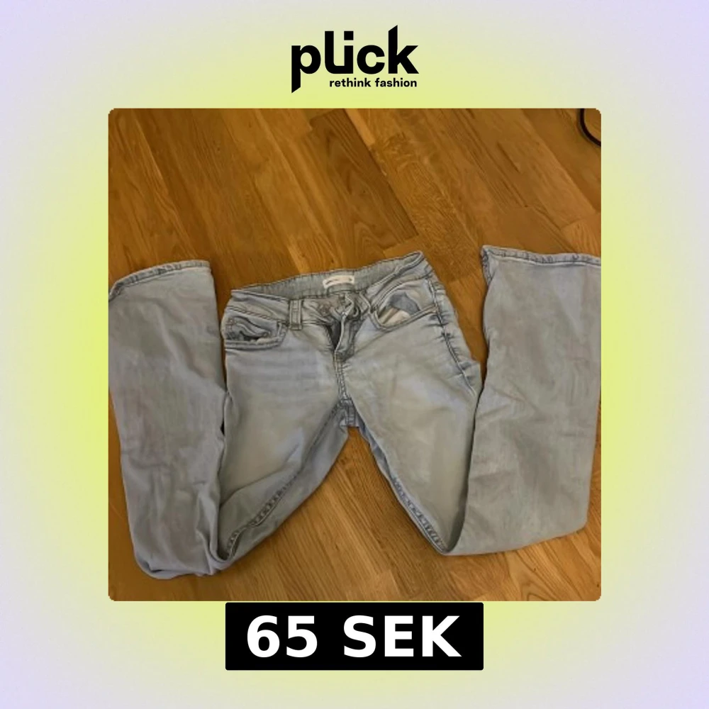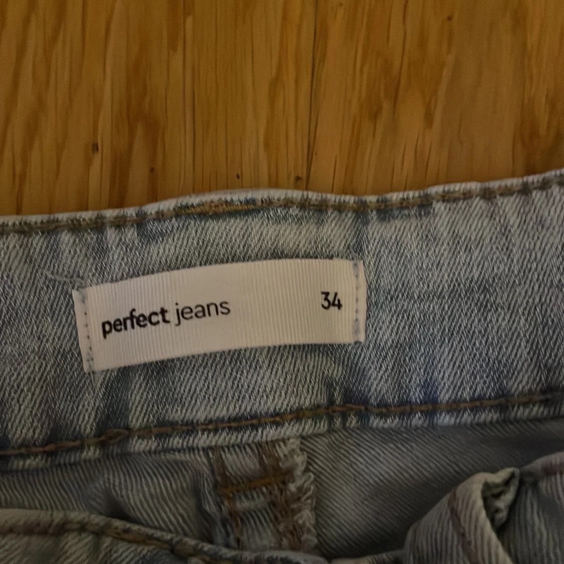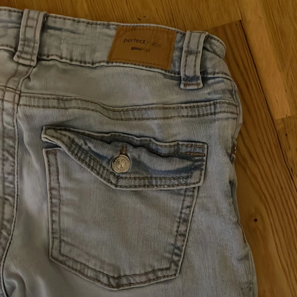 Säljer ett par ljusblå jeans från Gina Tricot, modell Perfect Jeans. De har klassisk femficksdesign med snygga ficklock och knappdetalj bak. Low waist bootcut jeans.