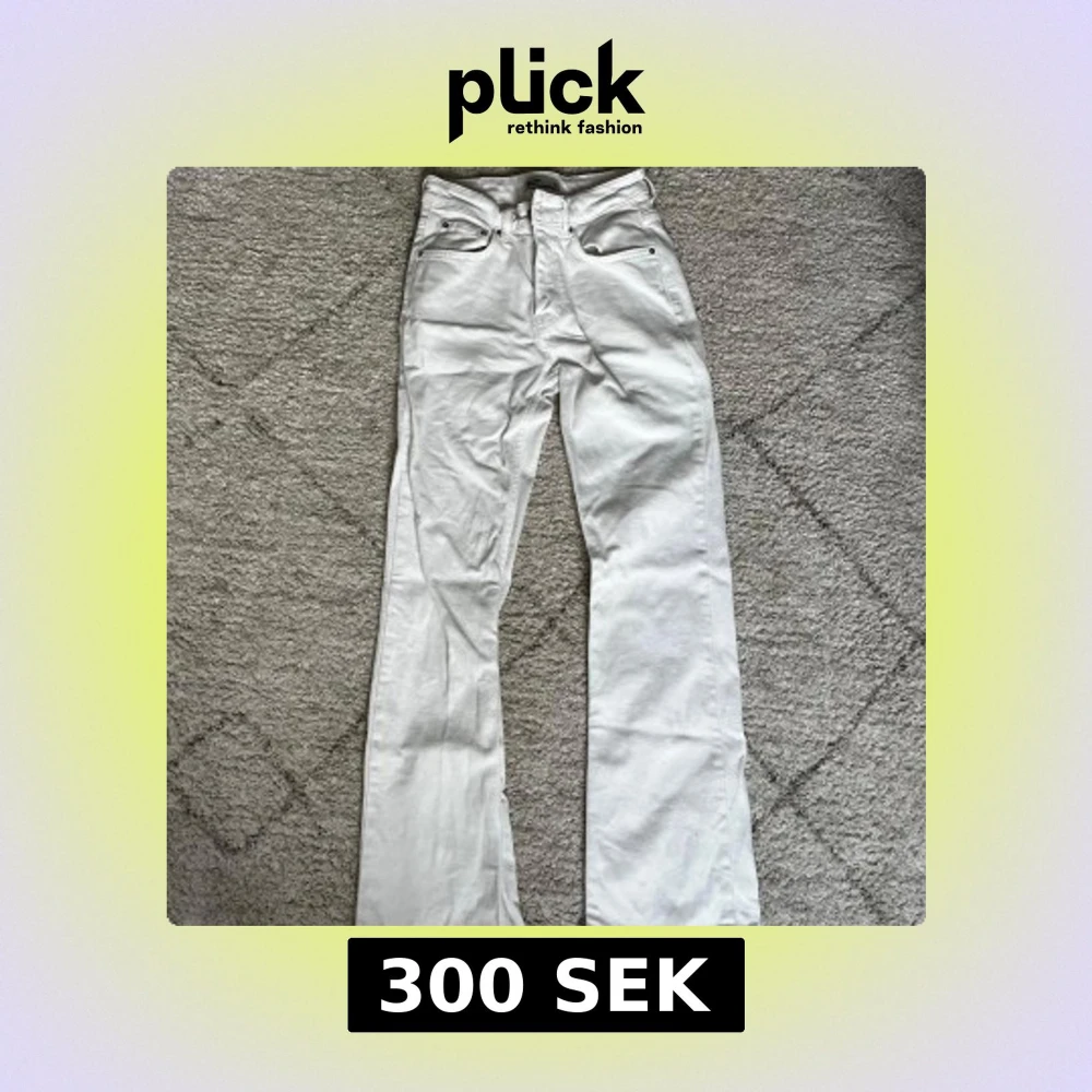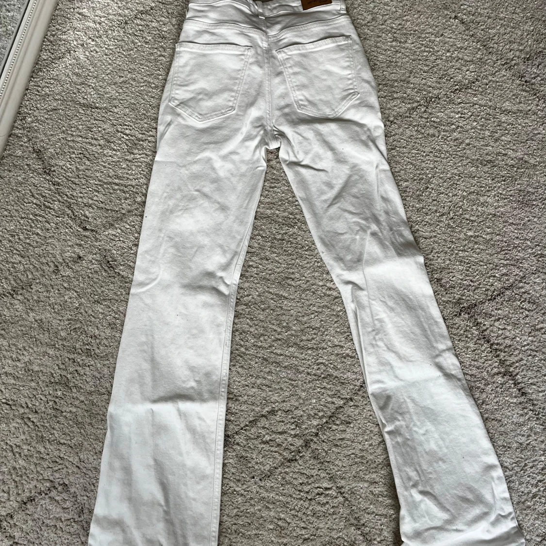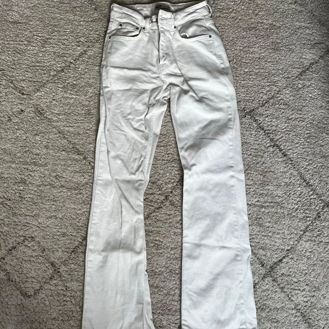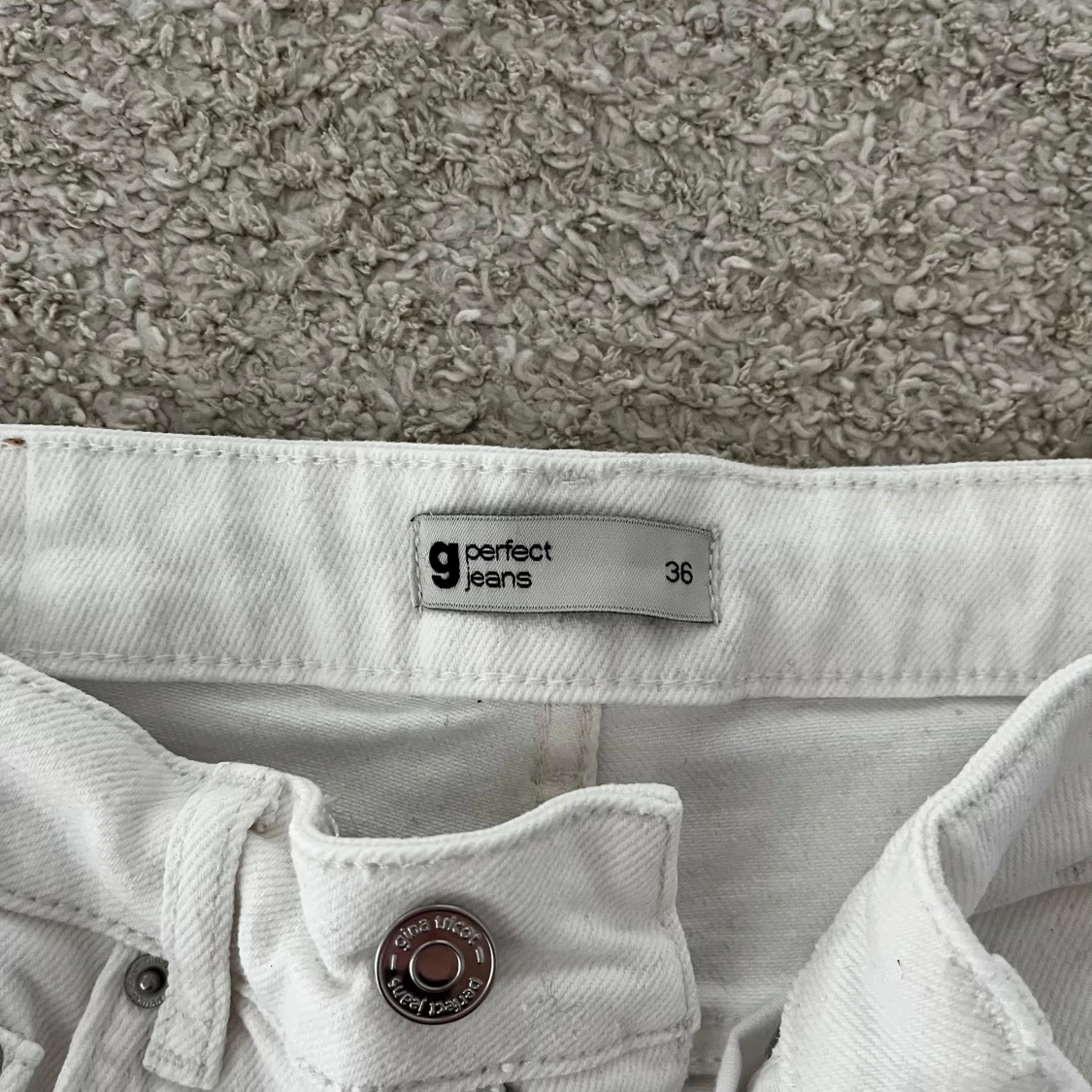 Snygga vita jeans från Gina Tricot jeans i storlek 36. Modellen har hög midja och raka ben med klassisk femficksdesign. Jeansen är tillverkade i ett stadigt bomullstyg och har silverfärgade nitar och knapp framtill.