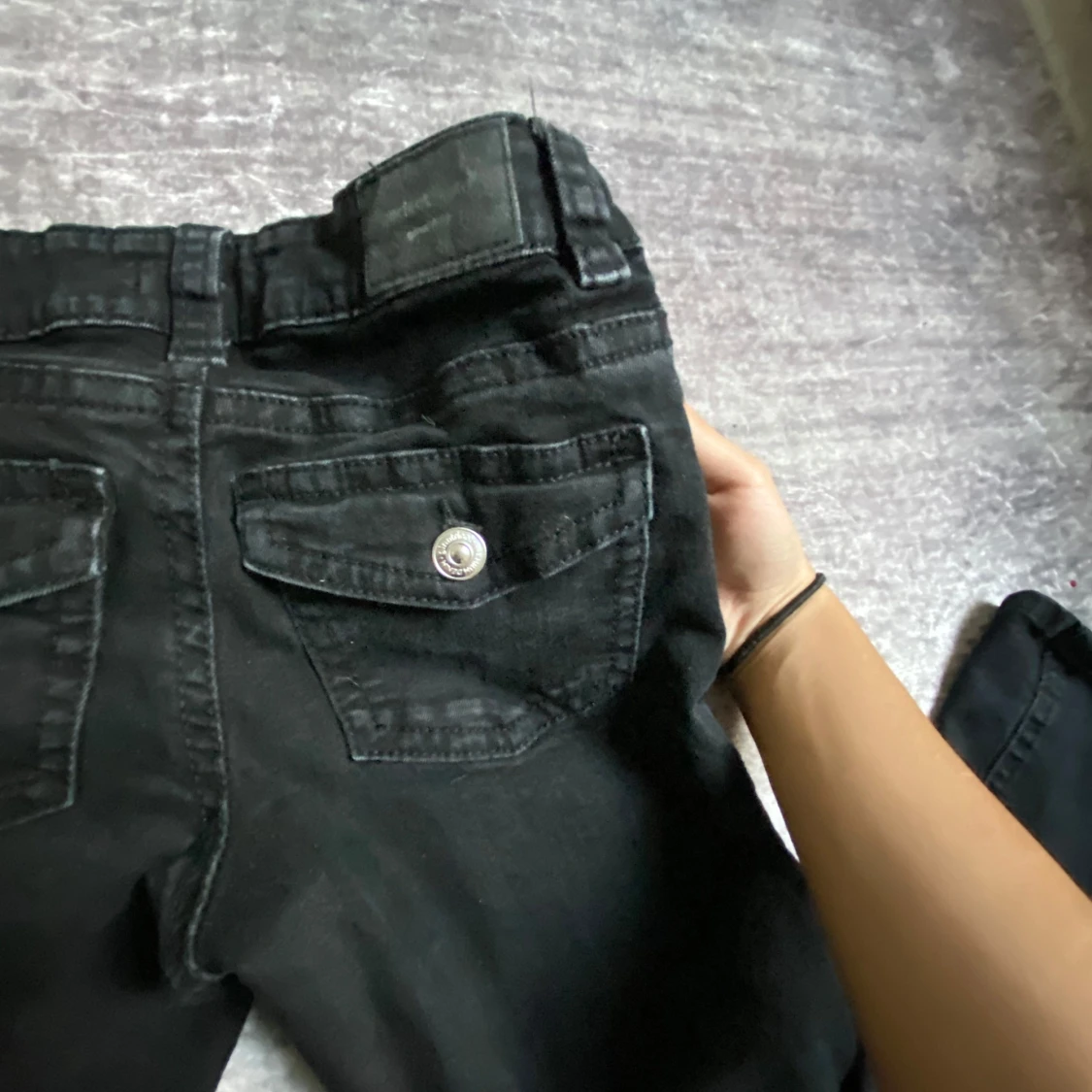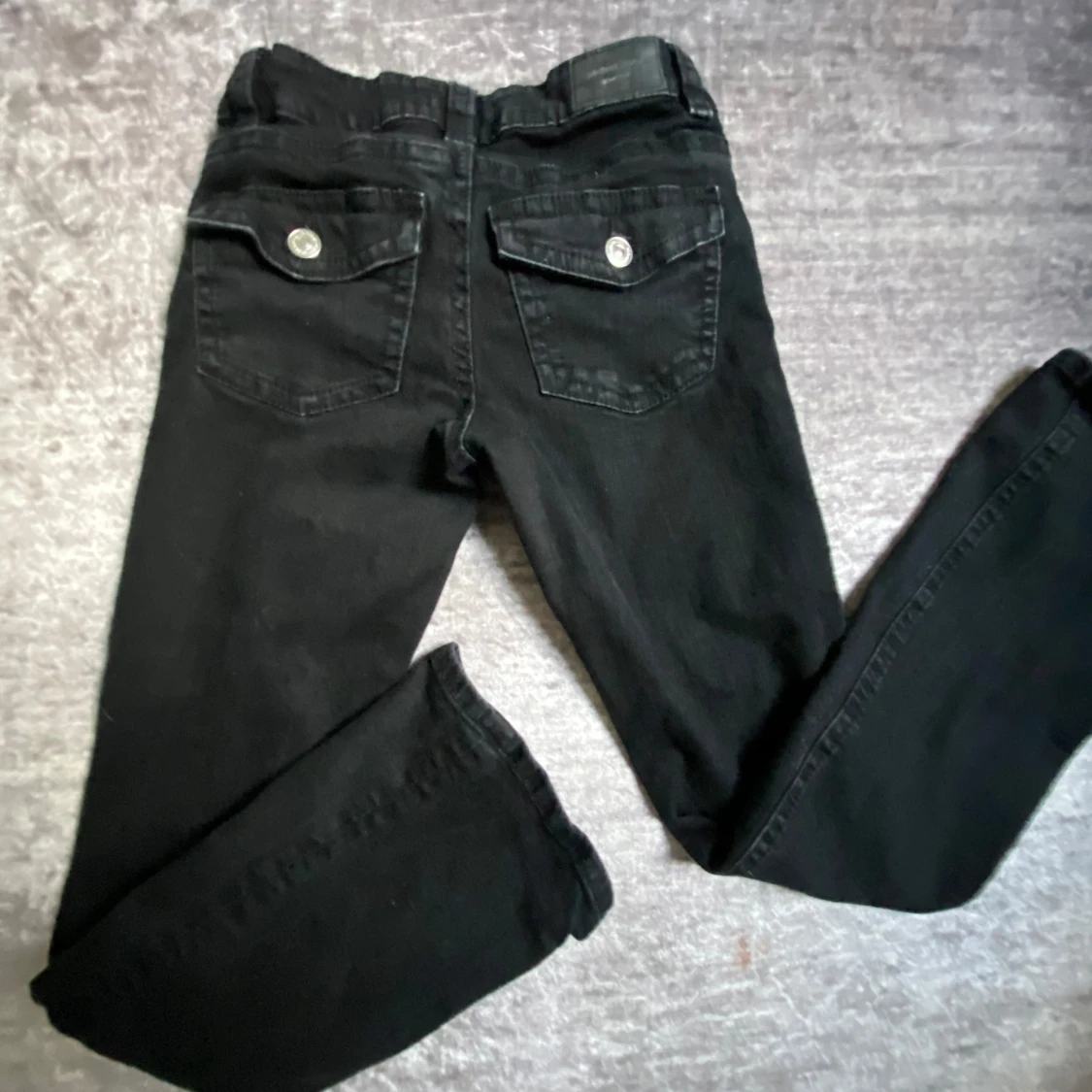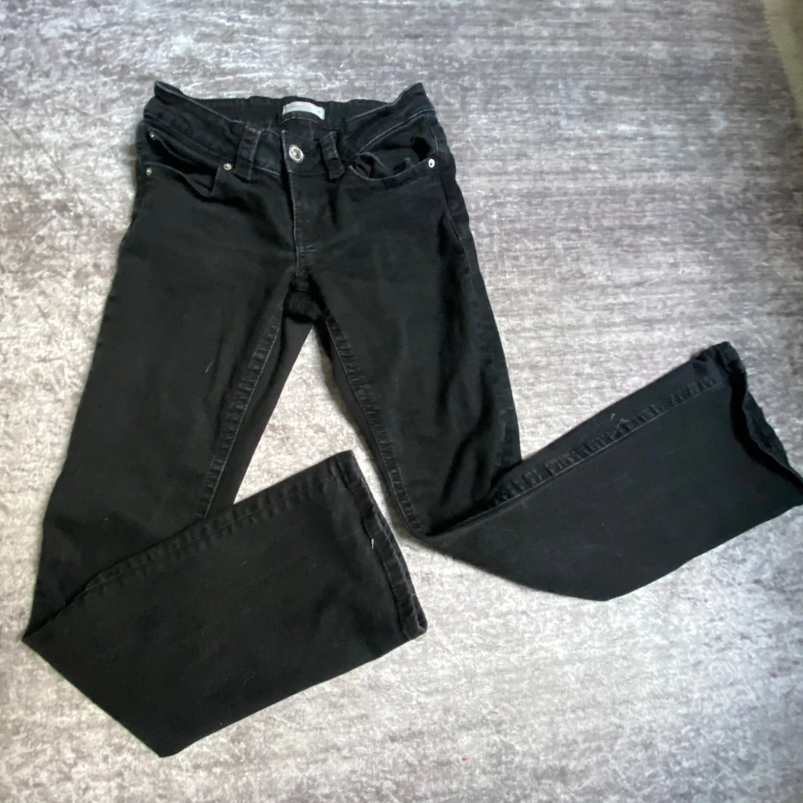 Svarta jeansbyxor med utsvängda ben och klassisk femficksdesign. Byxorna har knapp och dragkedja framtill samt fickor med lock och knapp bak. Perfekta för en stilren och enkel look. Säljer dom för nästan fullpris eftersom att dom är använda en gång.