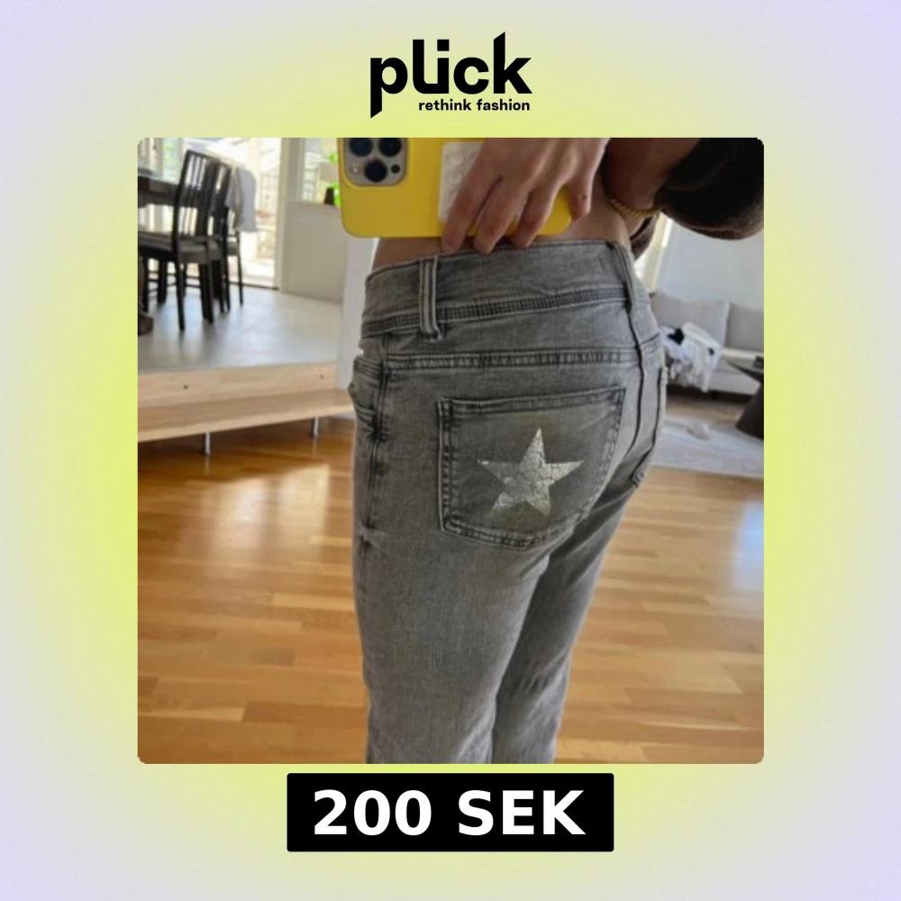Säljer ett par grå jeans med bootcut passform och låg midja. På bakfickan finns en snygg silverfärgad stjärna som detalj. Jeansen har klassisk femficksdesign och stängs med dubbla knappar framtill. Perfekta för dig som vill sticka ut lite extra.