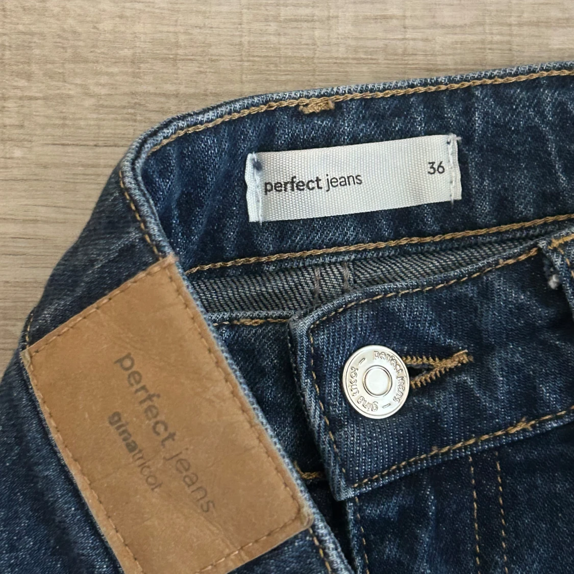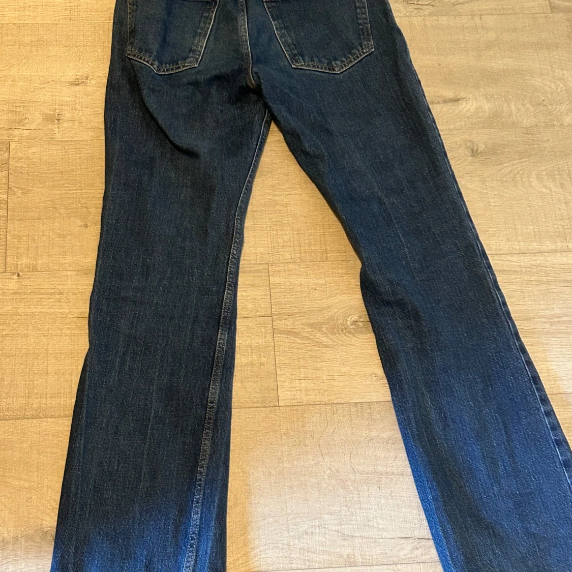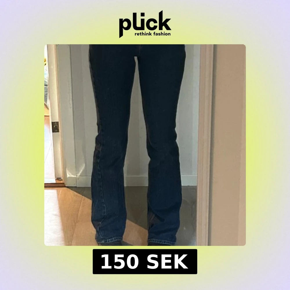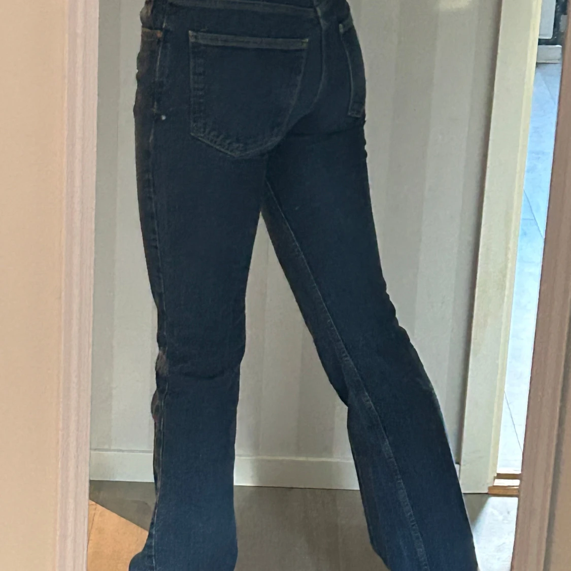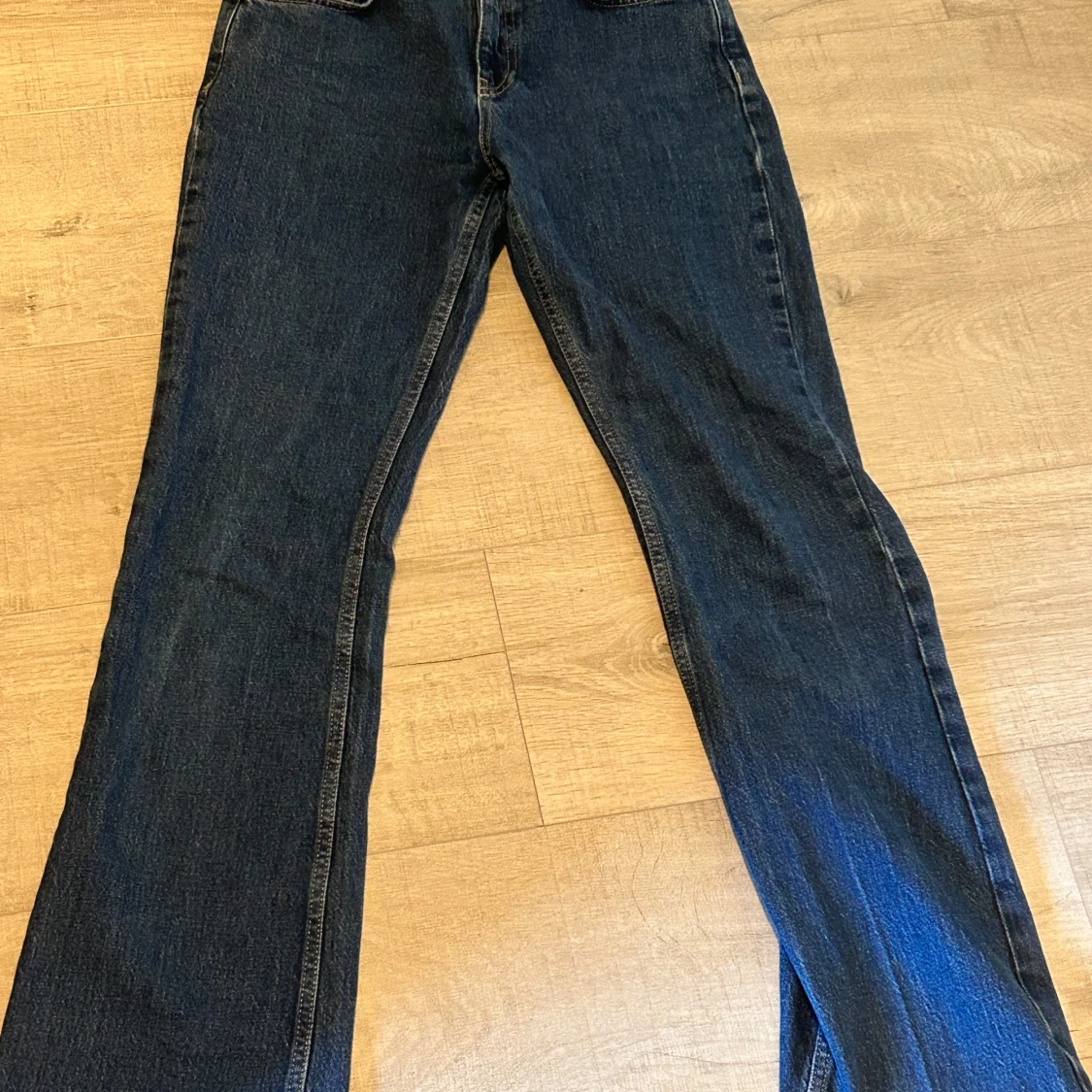 Säljer ett par mörkblå jeans från Gina Tricot. De har en klassisk design med en bootcut-stil och är hög midjade, är tillverkade i jeansmaterial. Perfekta för en avslappnad look.