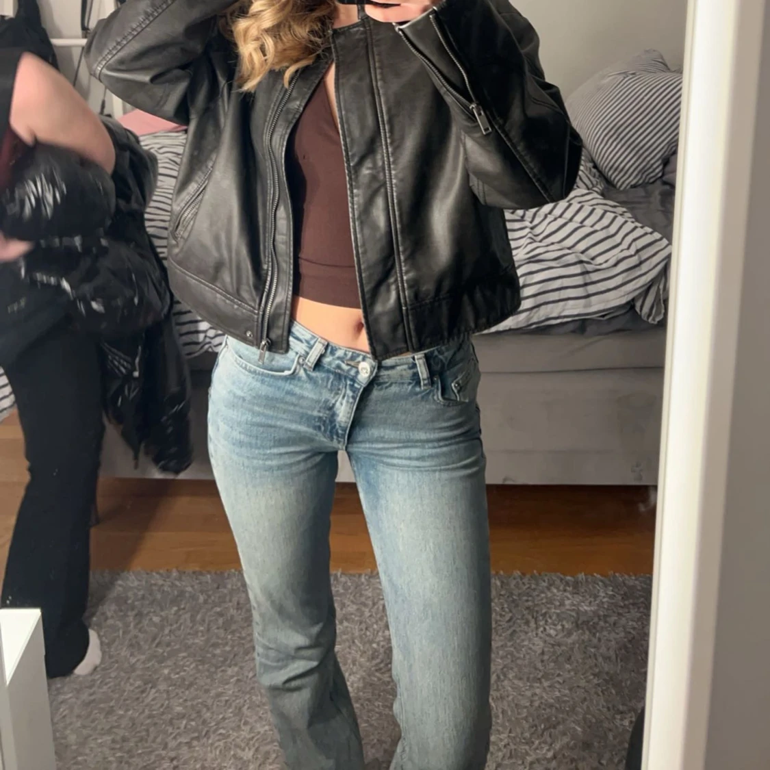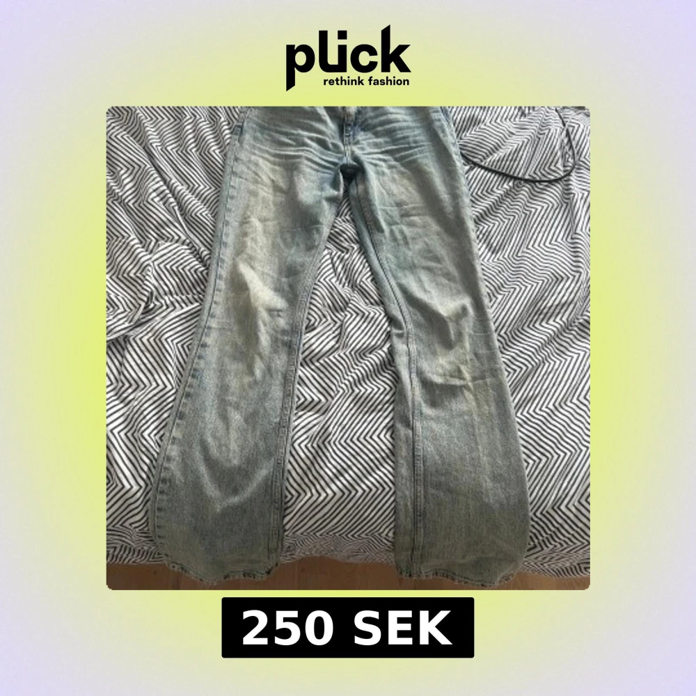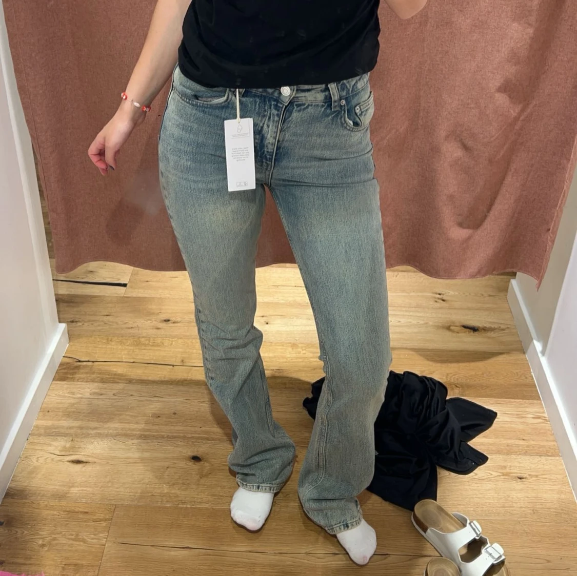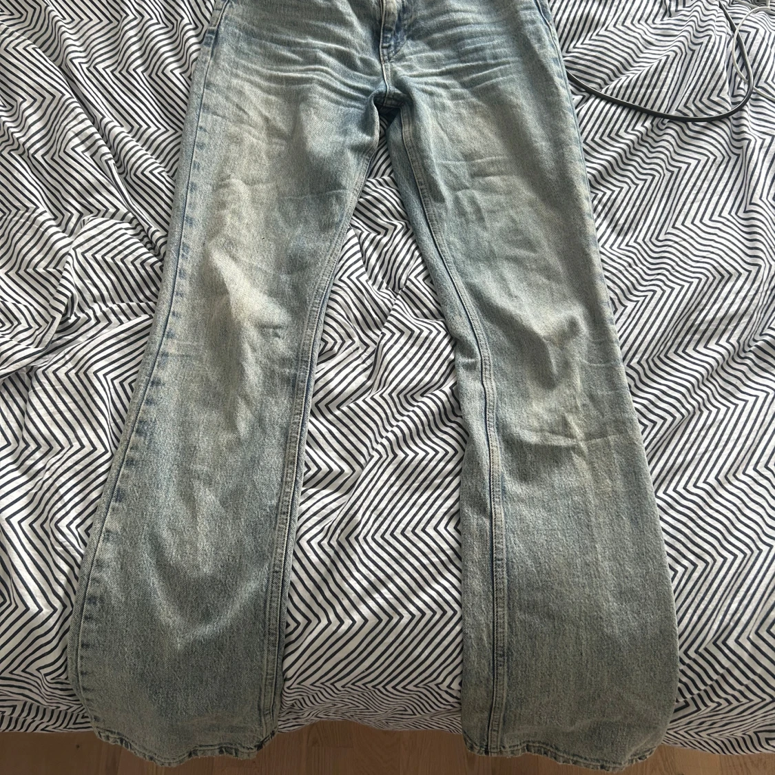 Säljer ett par klassiska jeans i ljusblå tvätt. Jeansen har en rak passform med bootcut, fyra fickor och knappgylf. Perfekta till vardagslooken och superenkla att styla med både sneakers och boots.