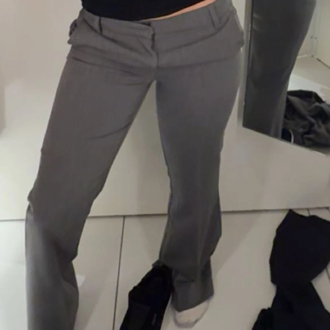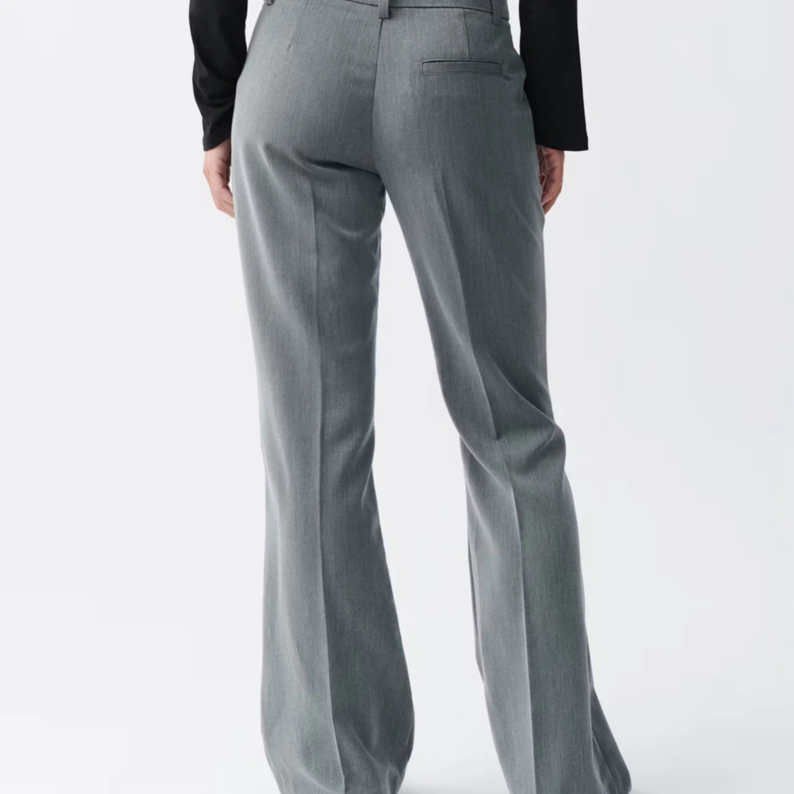 Snygga grå kostymbyxor med bootcut och låg midja. Byxorna har klassiska pressveck, hällor för bälte och stängs med dragkedja och knapp. Perfekta för en clean och stilren look. Materialet är slätt och känns dressat.