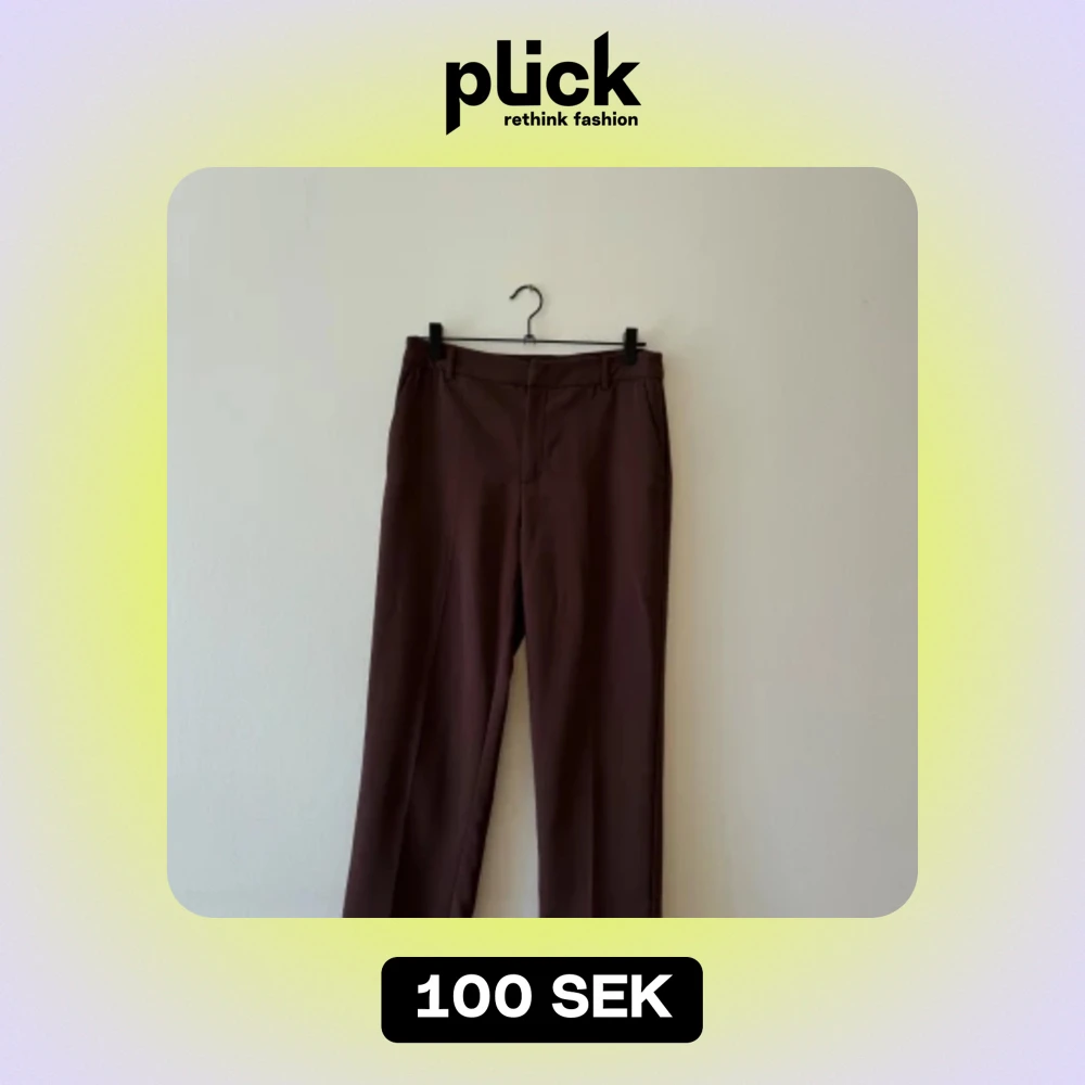 Säljer ett par stilrena bruna kostymbyxor från Gina Tricot. De är högmidjade och har en rak passform som ger en klassisk look. Byxorna är i ett mjukt och bekvämt material, perfekt för både vardag och fest. De har en diskret dragkedja och knapp framtill för enkel stängning.