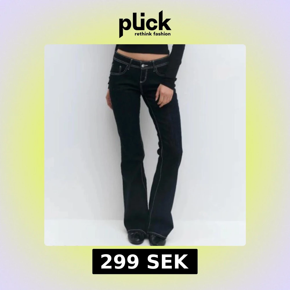 Snygga mörkblåa jeans från Gina Tricot med bootcut passform och låg midja. Jeansen har tydliga vita kontrastsömmar, klassiska fem fickor och stängs med knapp och dragkedja. Perfekta för en trendig och avslappnad look.