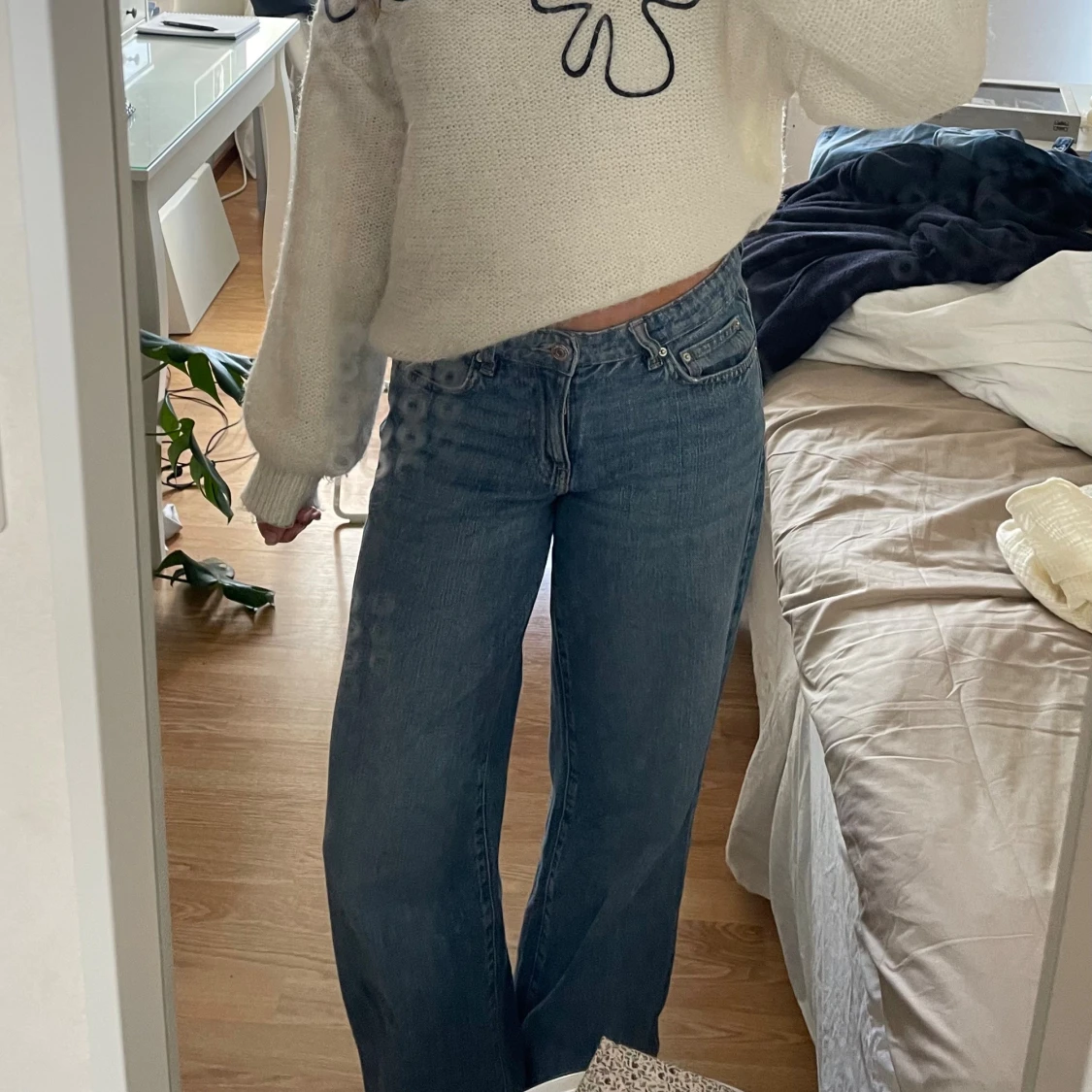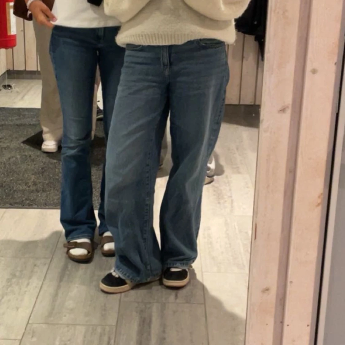 Säljer ett par blåa jeans med låg midja och breda ben. Jeansen har klassisk femficksdesign, dragkedja och knapp framtill. Perfekta för dig som gillar en avslappnad och trendig look. Materialet är jeans i bomull. Använda sparsamt i ca 3 månader! Uppsydda men går att lägga ner igen!