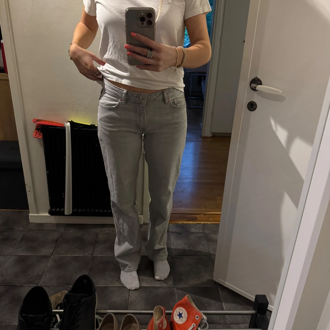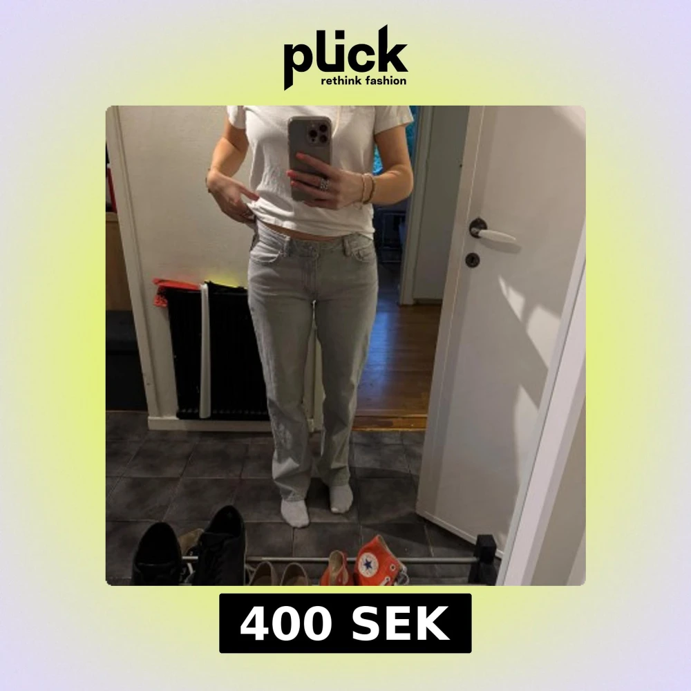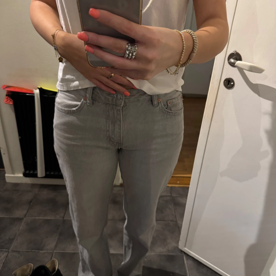 Säljer ett par ljusgrå jeansbyxor med klassisk femficksdesign och raka ben. Byxorna har normal passform och är midwaist. Knappt använda, från Gina tricot