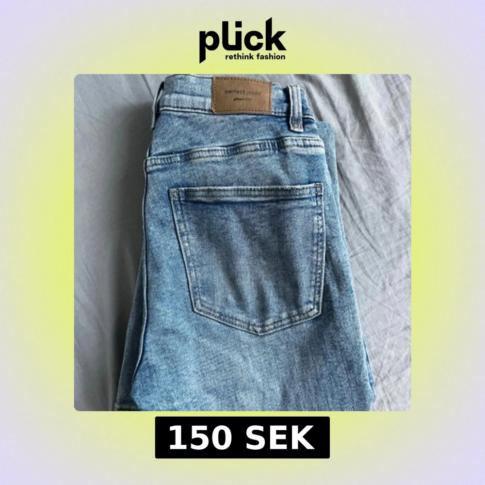 Säljer ett par ljusblå bootcut jeans från Gina Tricot. Normal passform och tillverkade i mjukt jeanstyg.