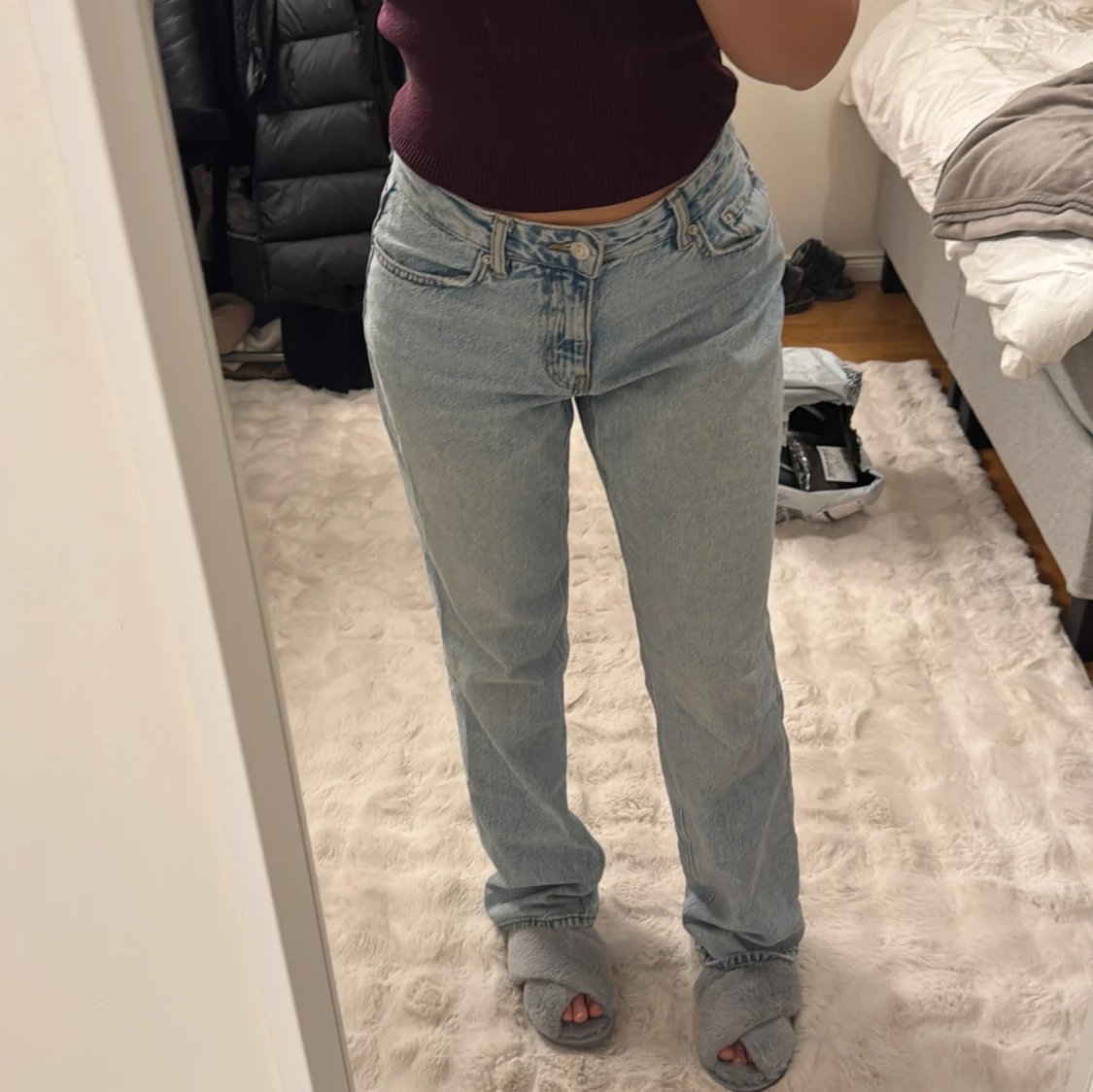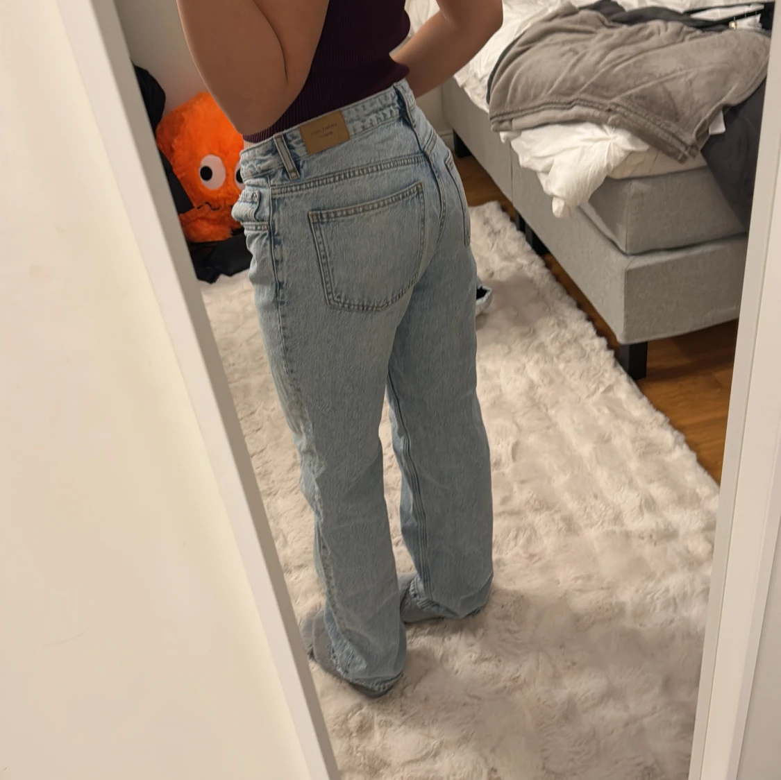 Snygga ljusblåa raka jeans från Gina. Ska egentligen sitta tajtare vid låren. De är högmidjade