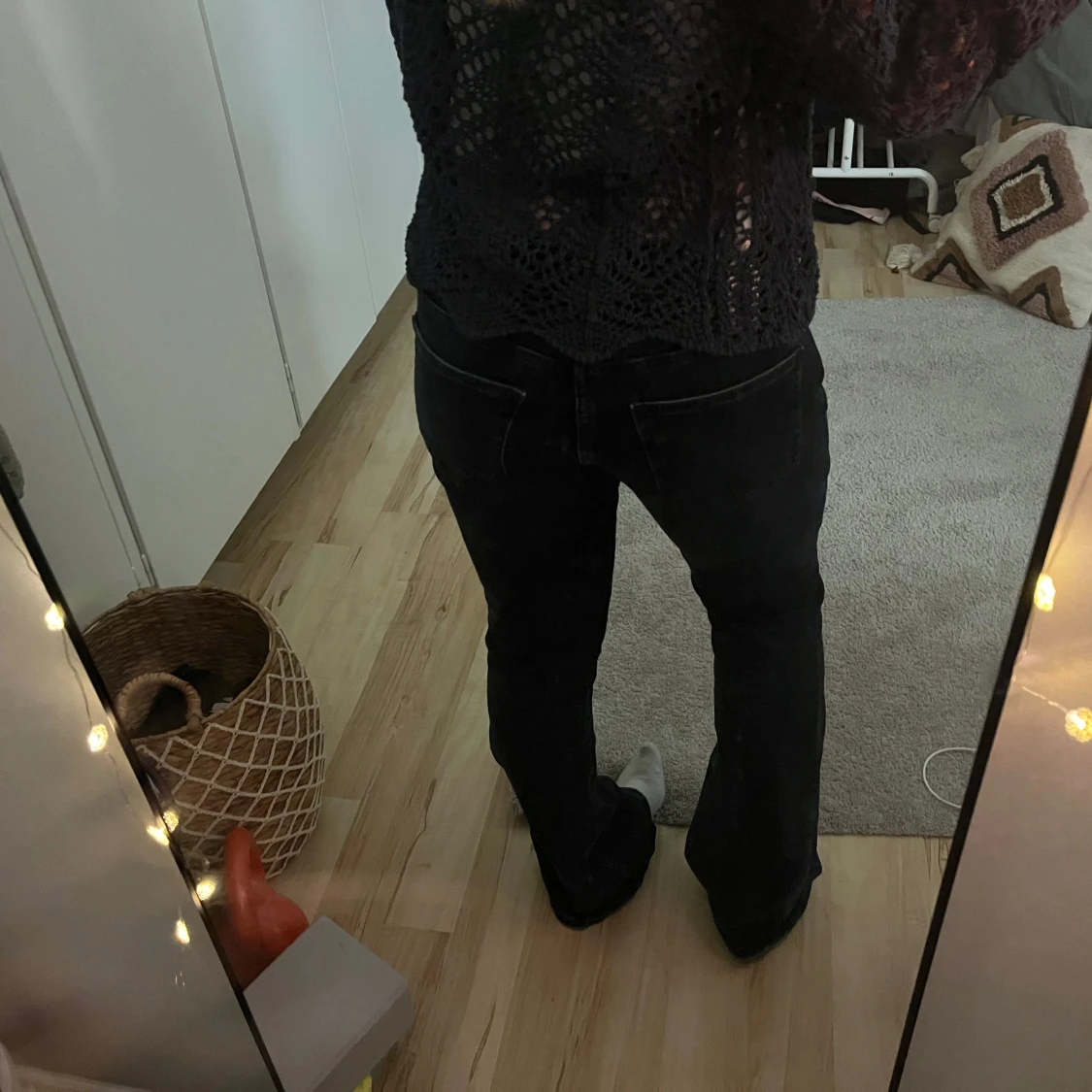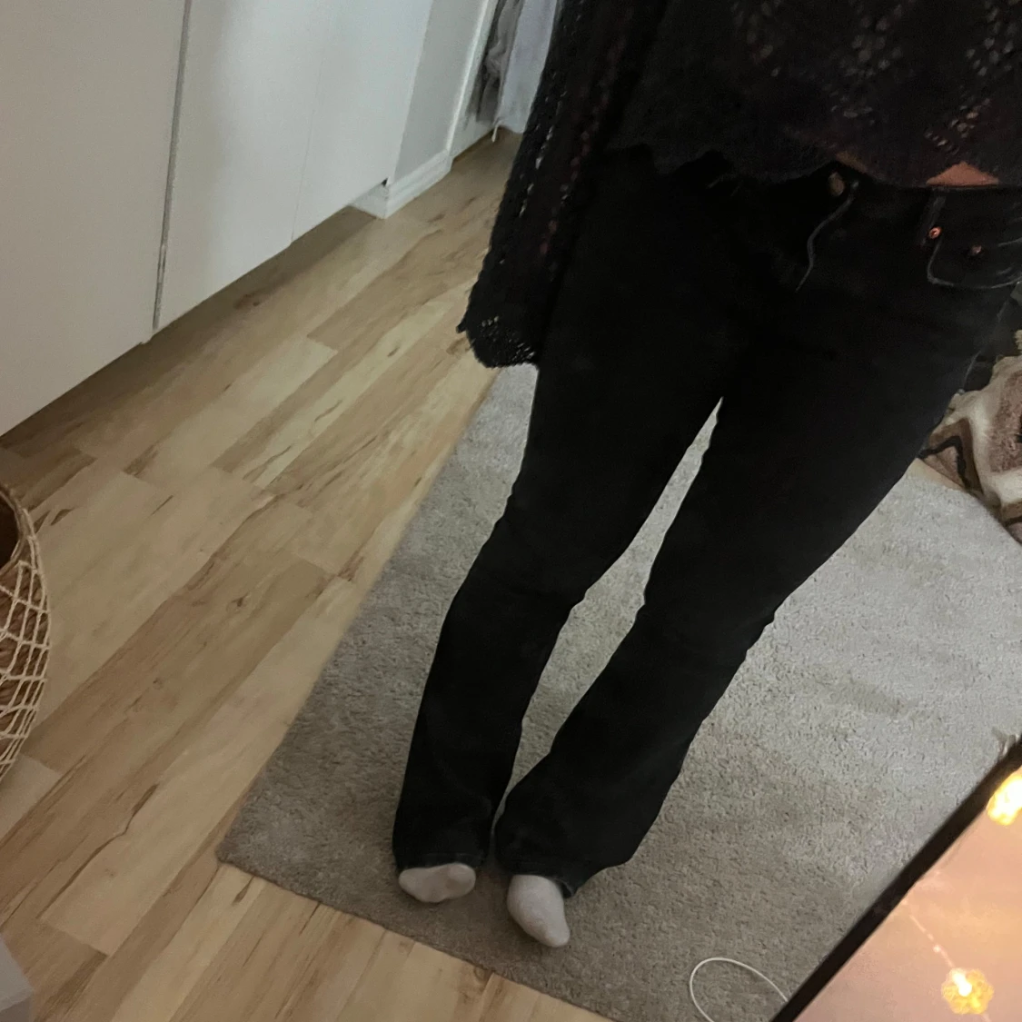 Snygga mörkblå jeansbyxor med en klassisk design. De har en låg midja och en bootcut-stil . Perfekta för att matcha med olika toppar och accessoarer. Jeansen är i storlek 38 men jag skulle säga att den har en passform som en 34a💕💕