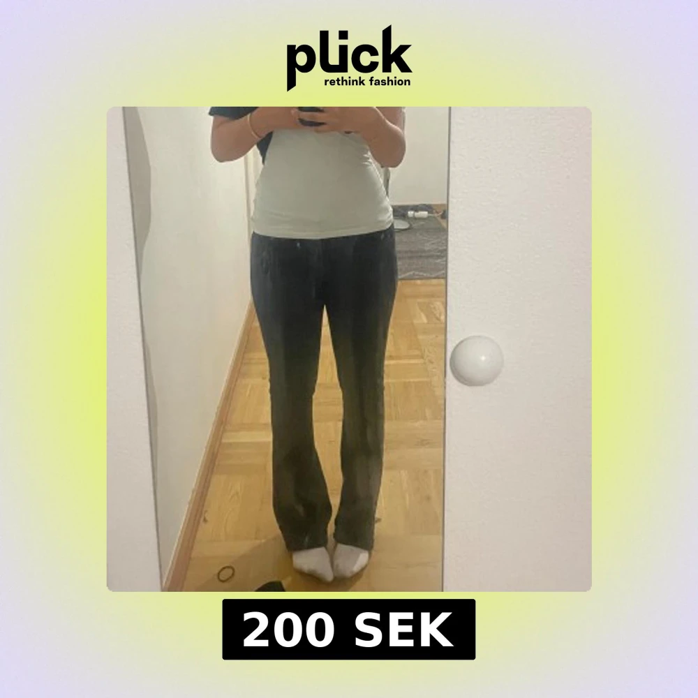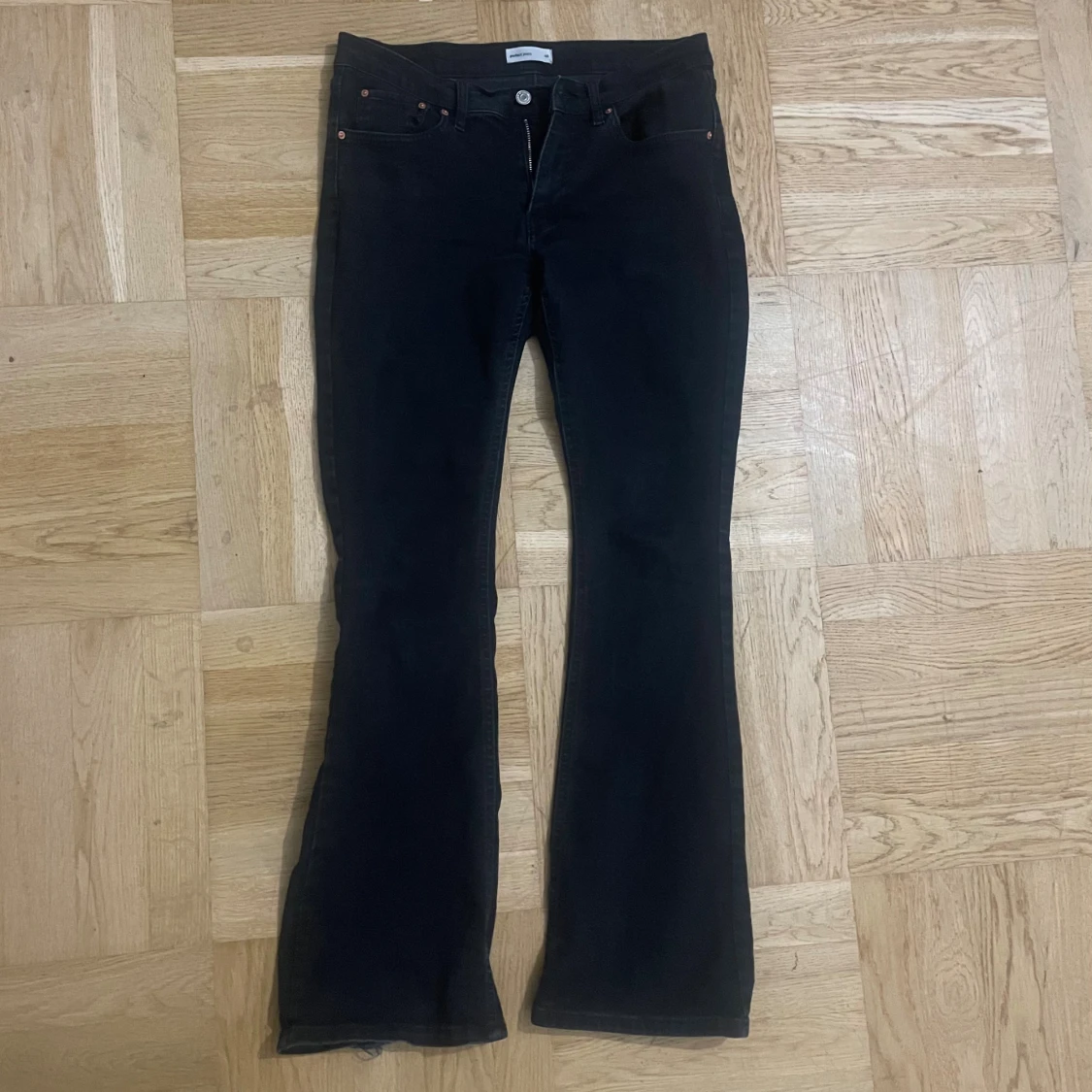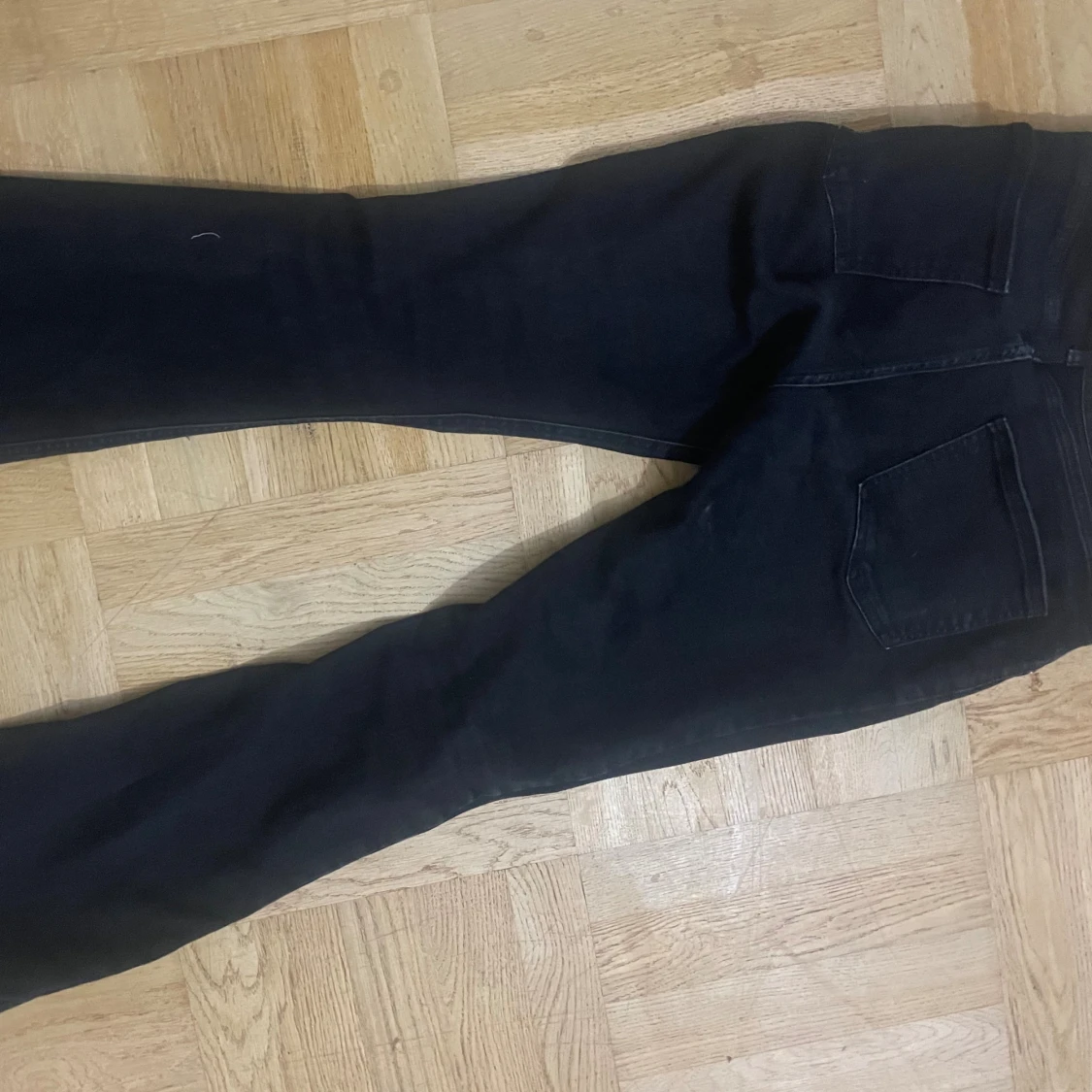 Säljer ett par svarta jeans med bootcut-modell. Jeansen har klassisk femficksdesign och är tillverkade i ett stretchigt denimtyg som sitter snyggt över höfterna och låren. Benviden är lite slitna. Nypris är 500kr!!!