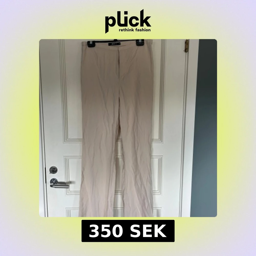 Säljer ett par stilrena beige kostymbyxor från Gina Tricot. Byxorna har raka ben, perfekt för en clean och enkel look. Passar dig som gillar klassiska och tidlösa plagg. Det är endast använda en gång till ett White party. de är i storlek 40 men jag är vanligtvis S eller M och valde att ha dem som lite mer baggy💞