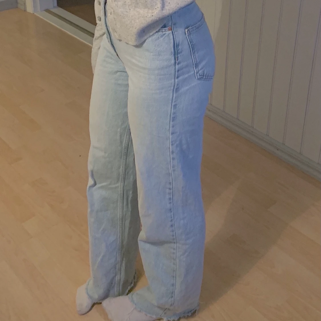 Långa utsvängda jeans från Gina tricot. Väldigt töjbara jeans som är stor i storleken. Fin ljusblå färg och långa. Storlek 32 men passar även er som har 34/36. Köpta för 600 kr