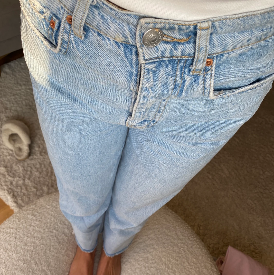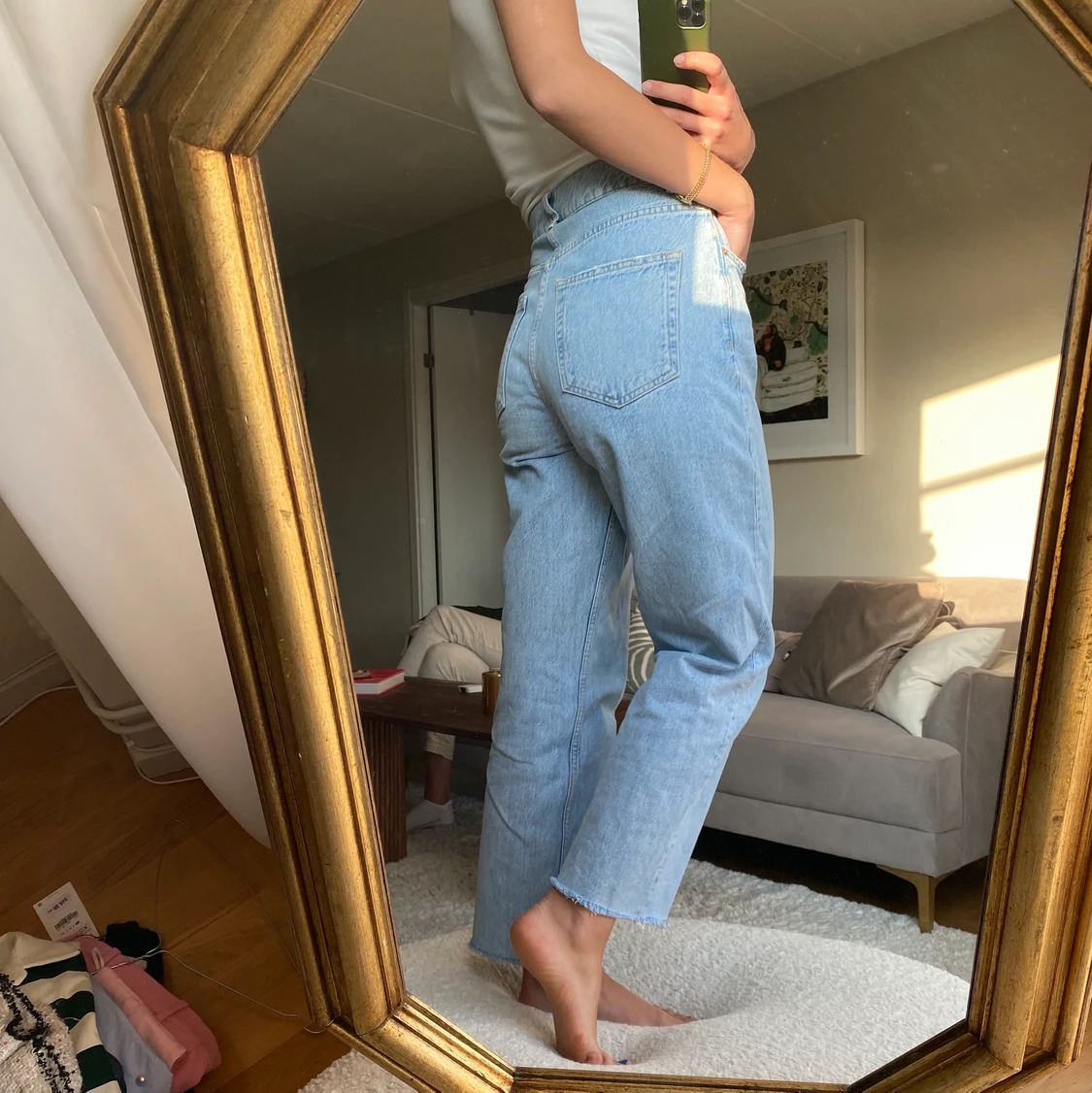 Supersnygga raka jeans med hög midja. Fin, ljus denimfärg. Avklippta och därför fransade nertill. Från Gina Tricots good project kollektion. Ordinarie pris 499kr