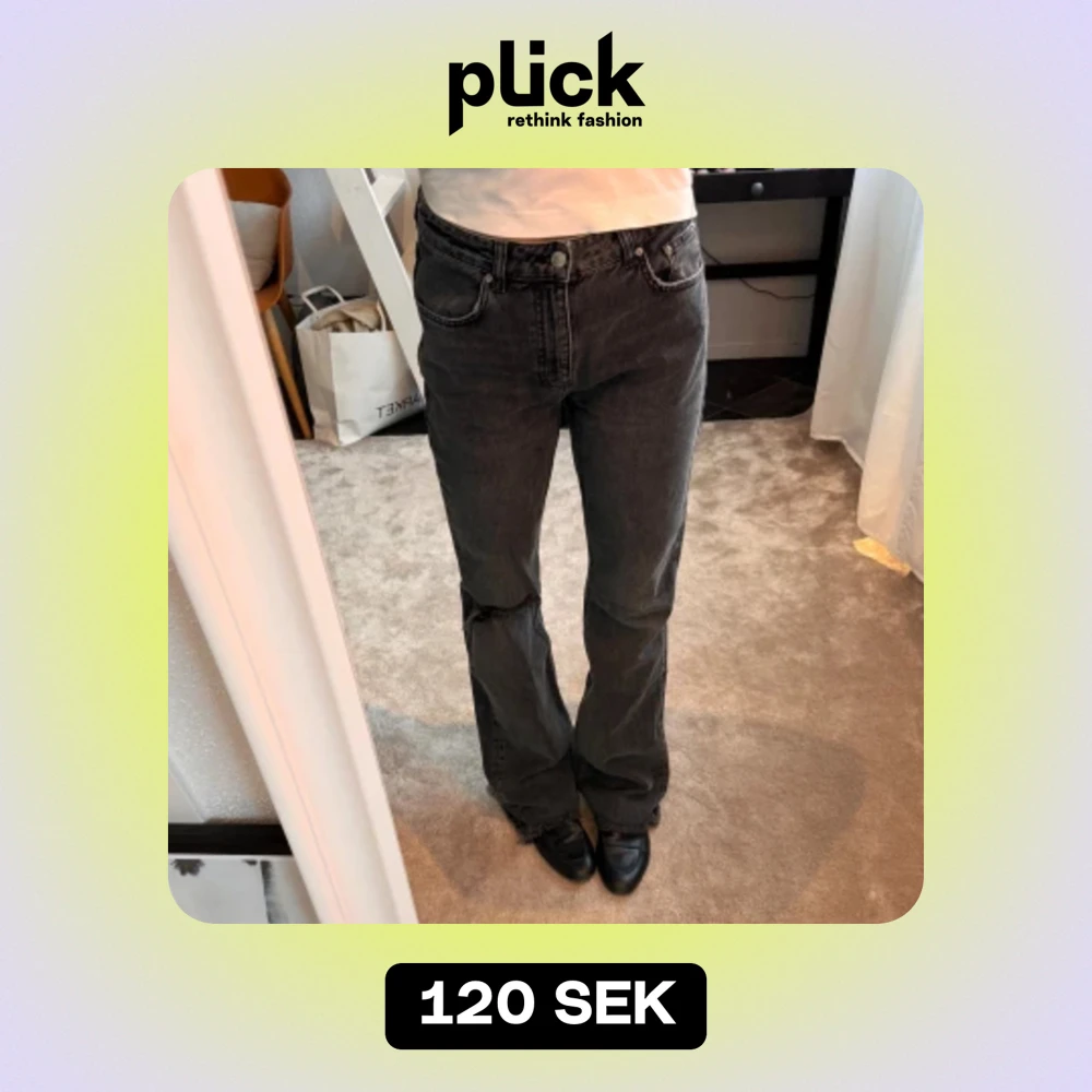 Jeans från Gina Tricot i grå bootcut modell med hål på ena knät. Jeansen är rätt långa och perfekta till klackar🩷
