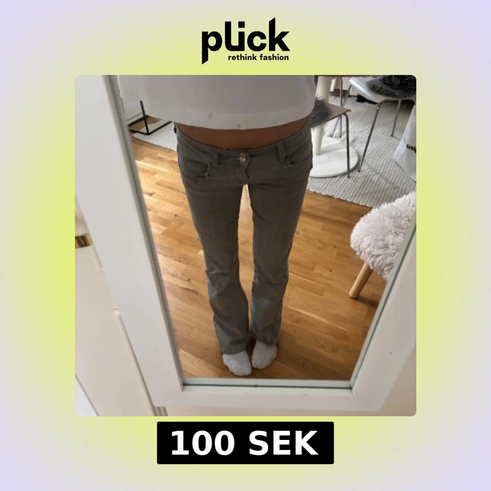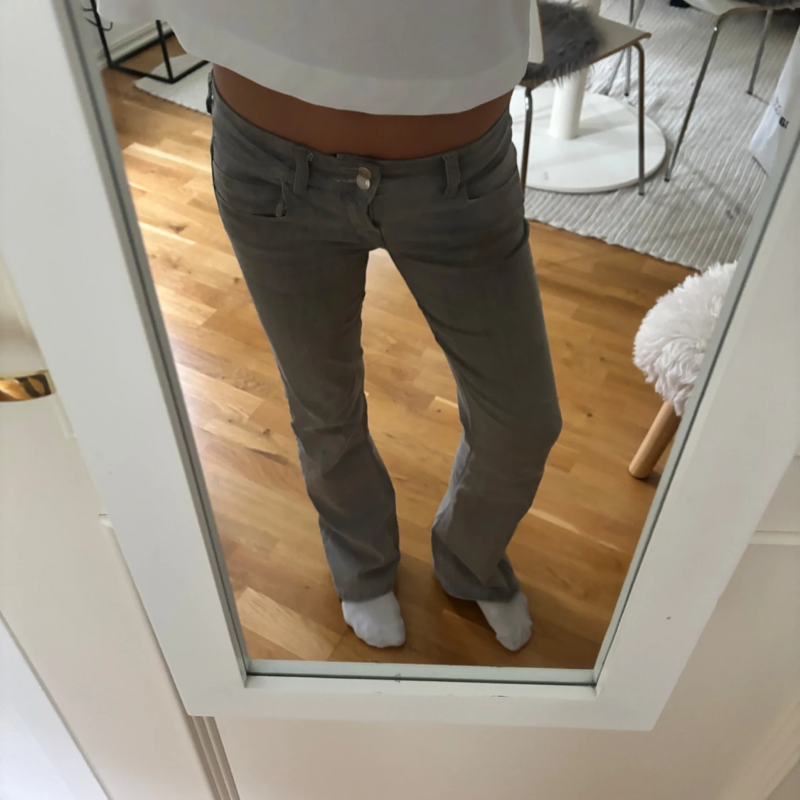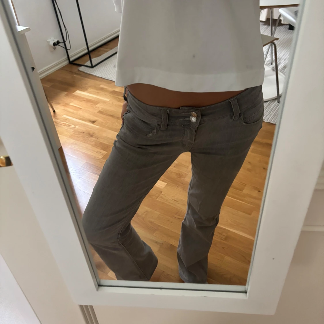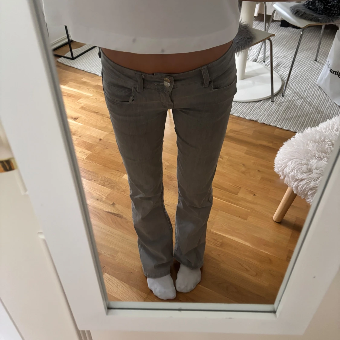 Säljer dessa low waist bootcut jeans från Gina tricot i storlek 152. Dem är gråa och har vanliga fickor och två knappar fram! Dem är super sköna men säljer då jag aldrig använder dem❤️inga defekter alls