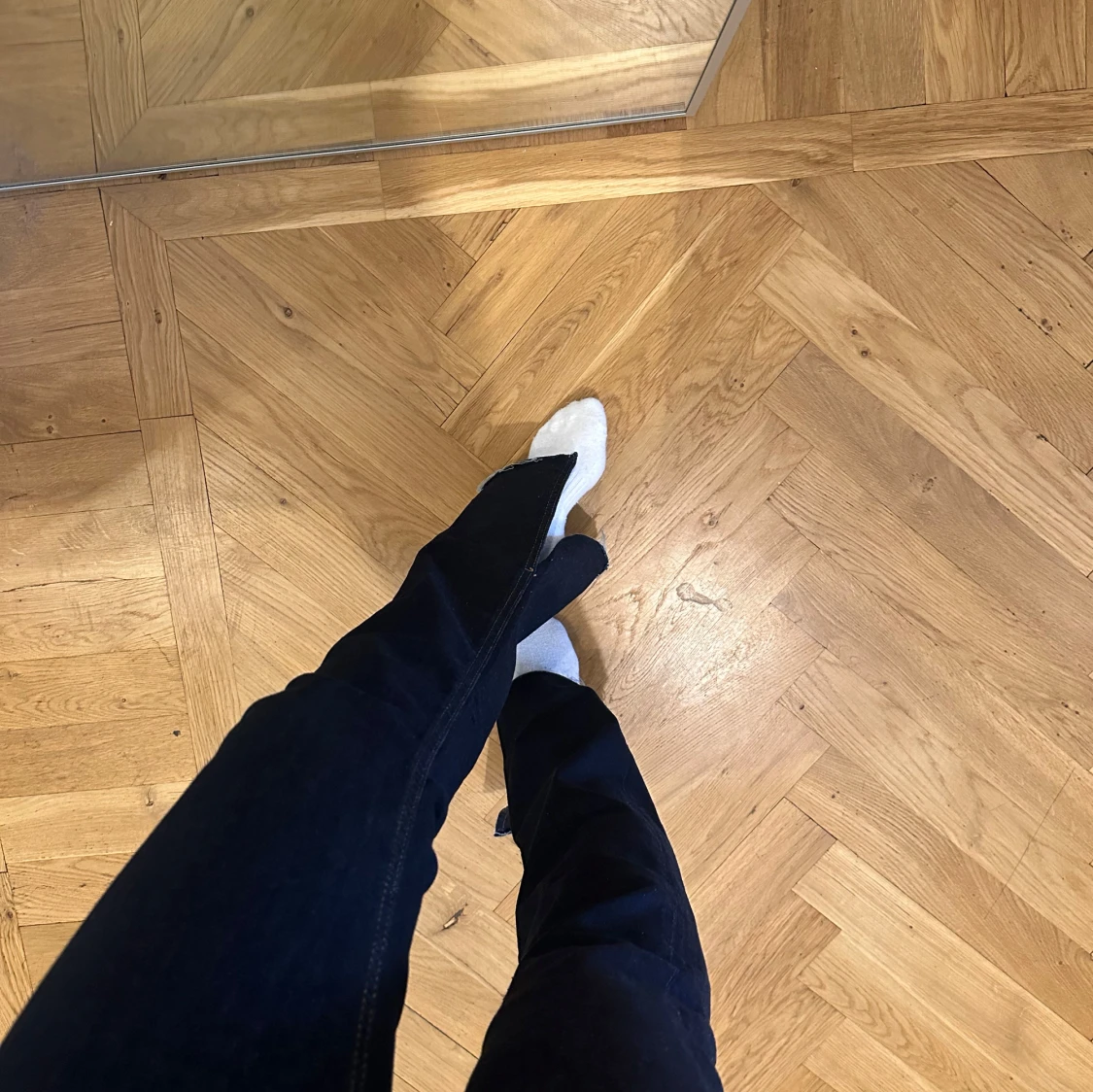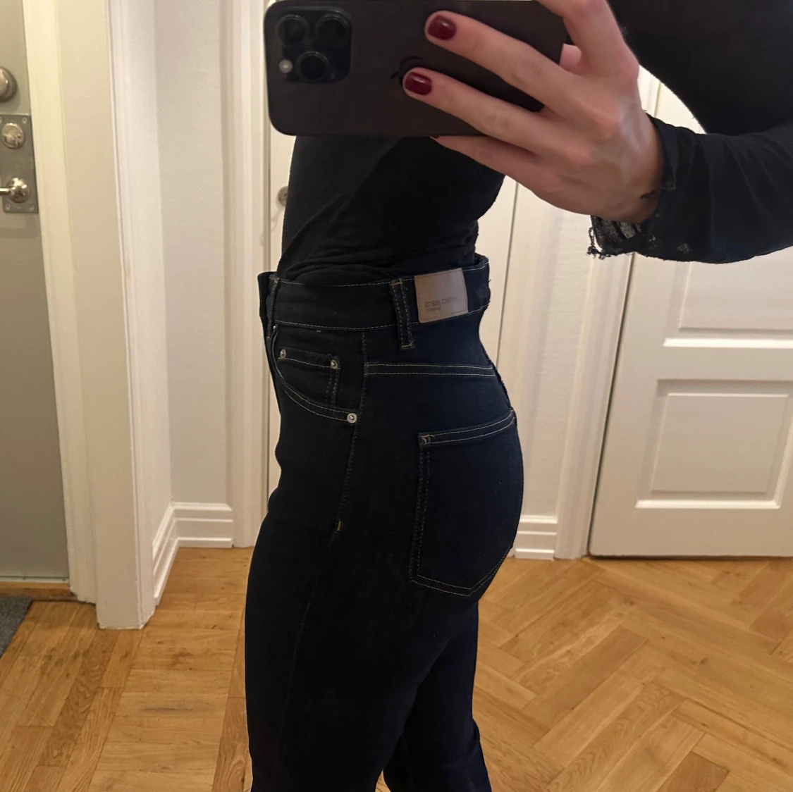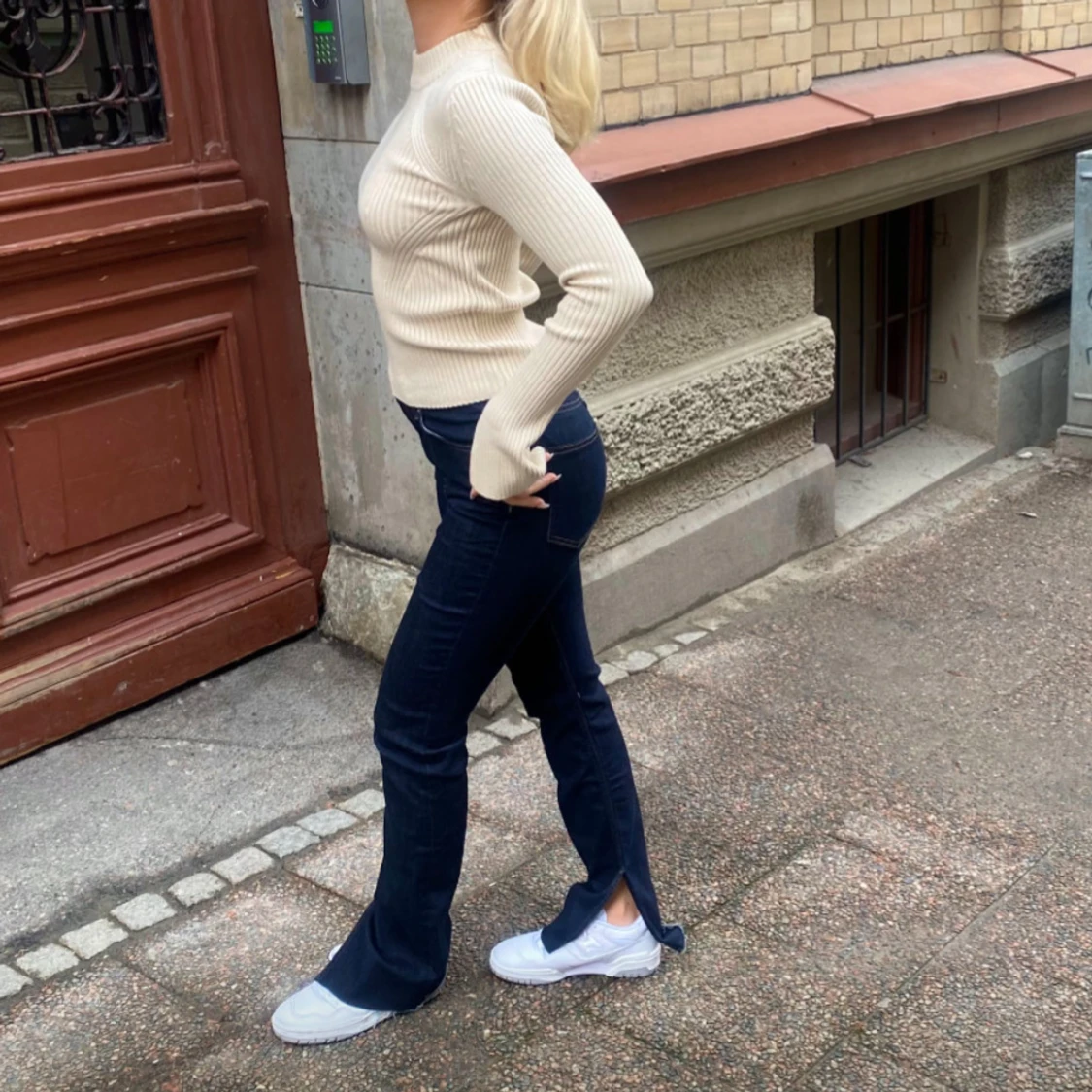 Perfect fit jeans från Gina Tricot. Mörkblå med beiga sömmar och slits. Slim fit men raka från låren och neråt. Väldigt stretchiga. Använda 1 gång, nyskick. Jag är 168cm