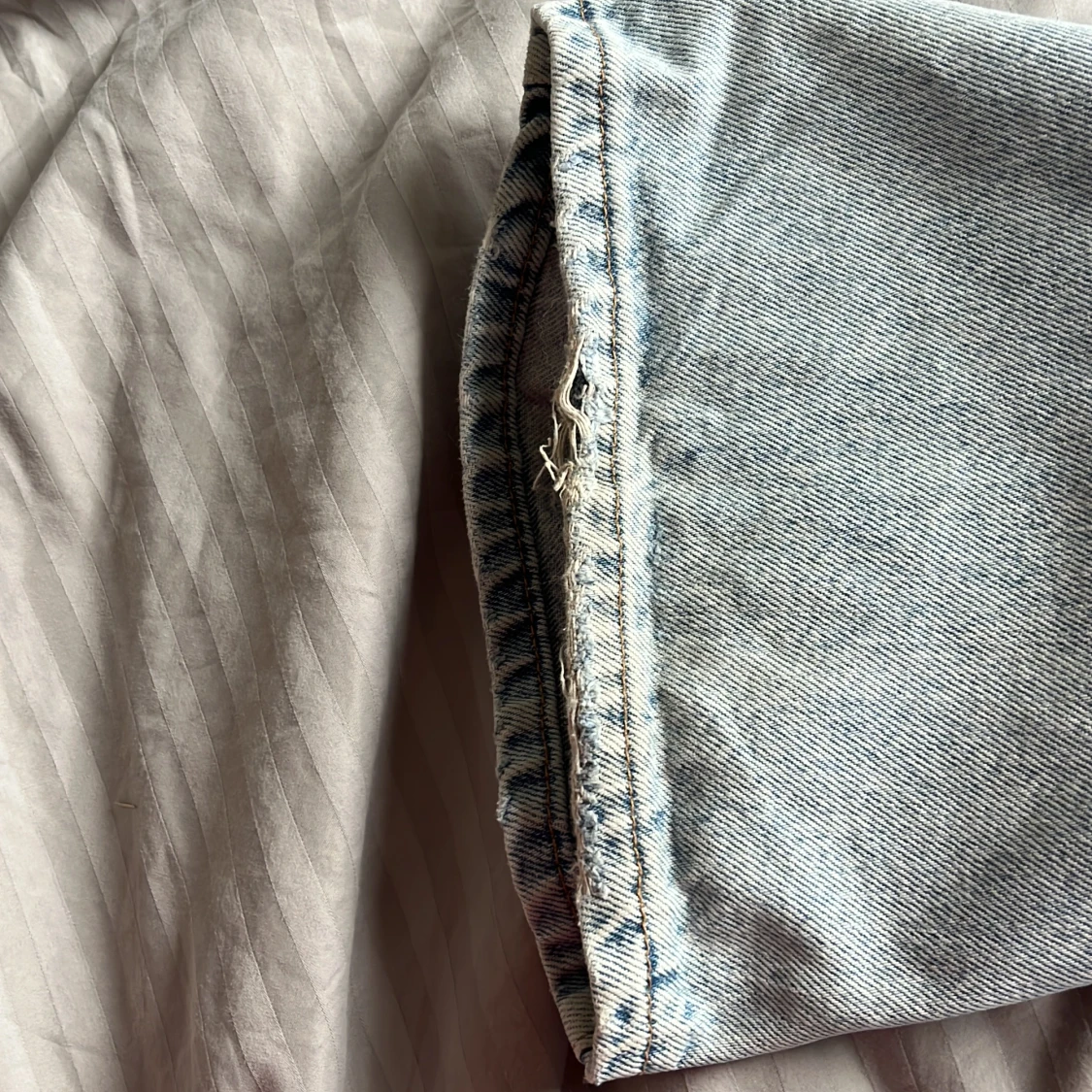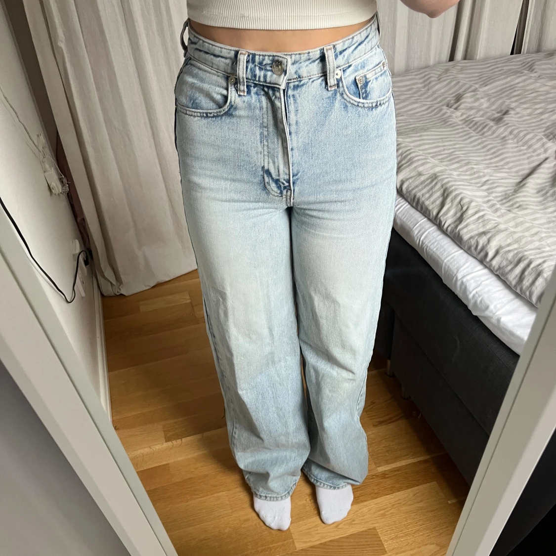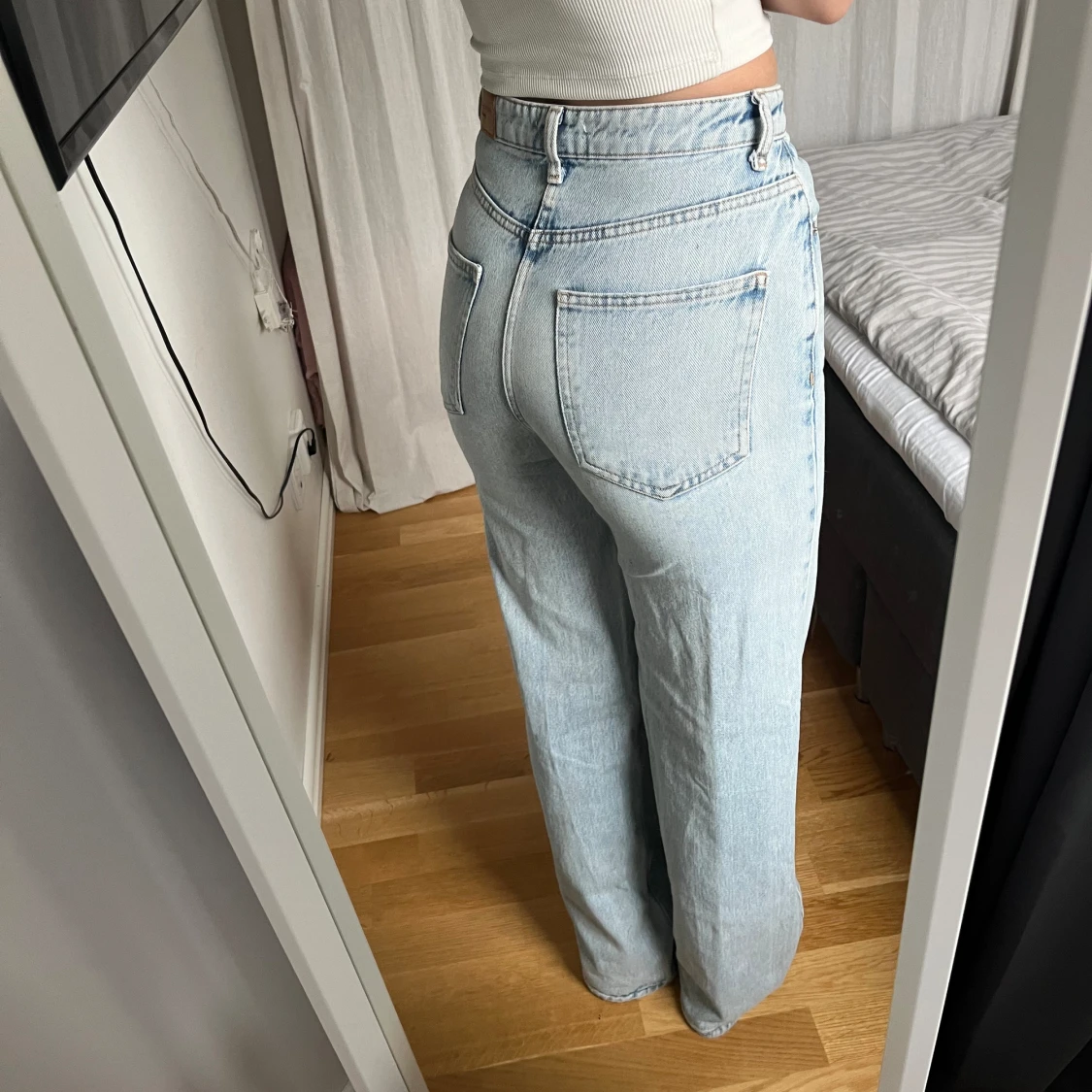 Ljusa högmidjade jeans från Gina tricot som tyvärr blivit för små för mig. Lite slitna lägst ner på ena benet (se bild) eftersom de är ganska långa. Annars härligt fint skick🥰
