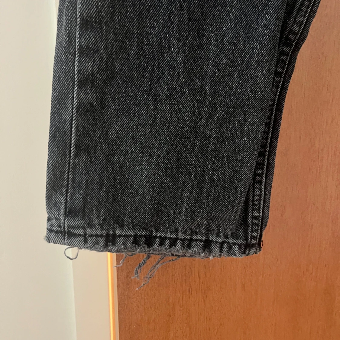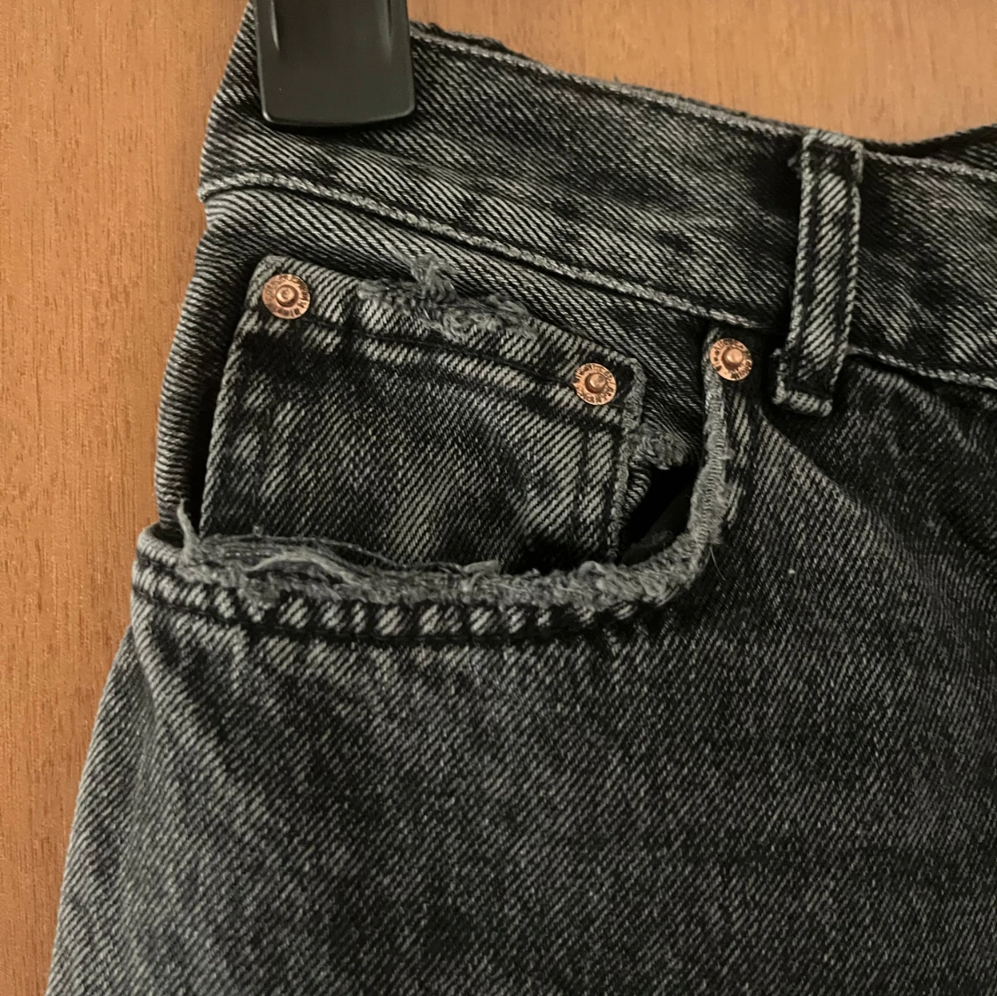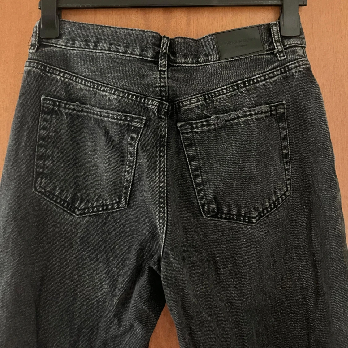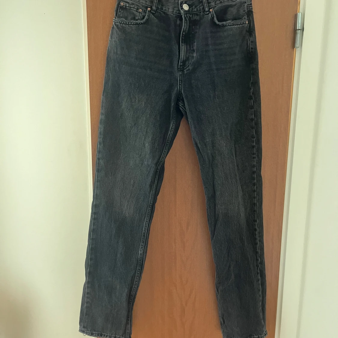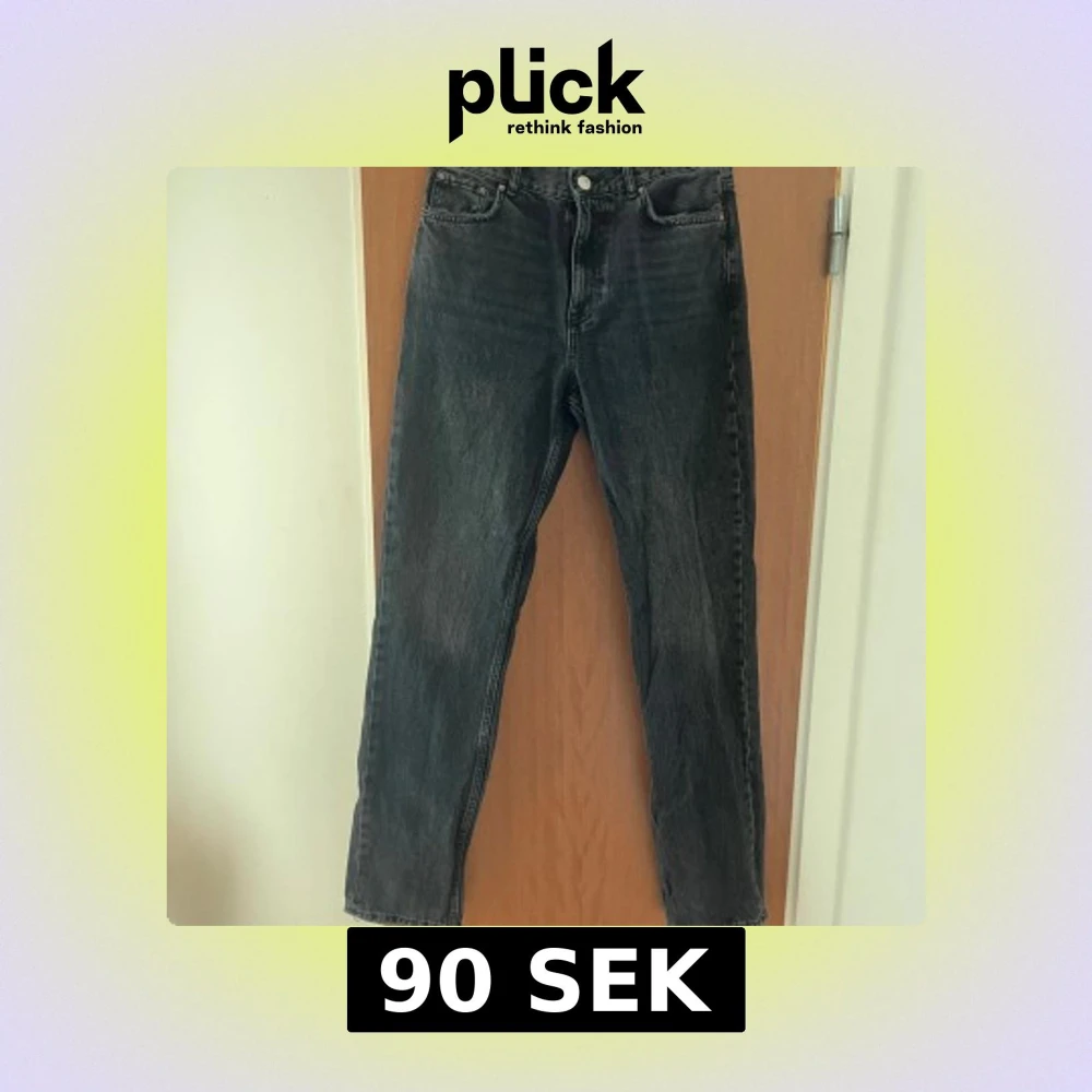 Snygga svarta jeans från Gina tricot med medel hög midja och raka ben. Jeansen har en tvättad look och sliten stil vid fickor och benslut, det var så när de köptes så det är inget slitage