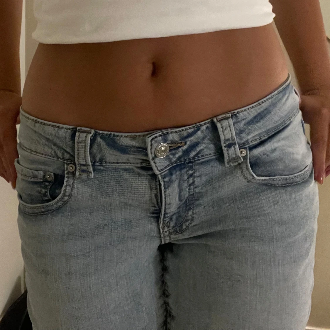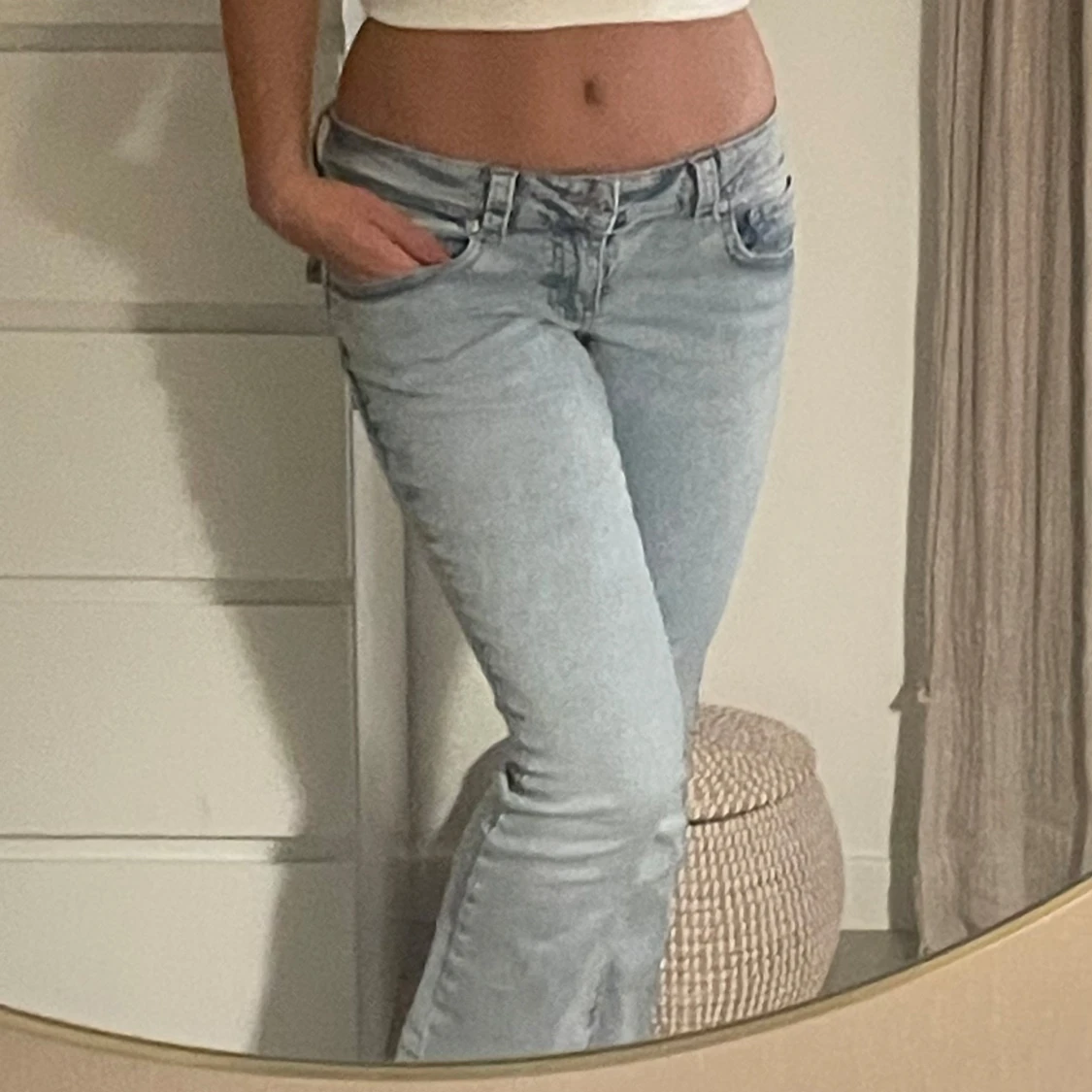 Säljer ett par ljusblå jeans från gina tricot. De har en vintage look, och är tillverkade i bomull med stretch för komfort. Perfekta för en casual stil som passar till vardags. Både fram- och bakfickor är tydligt synliga, och jeansen har en knapp- och dragkedjeförslutning. Från deras y2k collektion. Inga defekter och säljer pga för korta för mig. Jag är 170cm och midjemåttet är 40-42