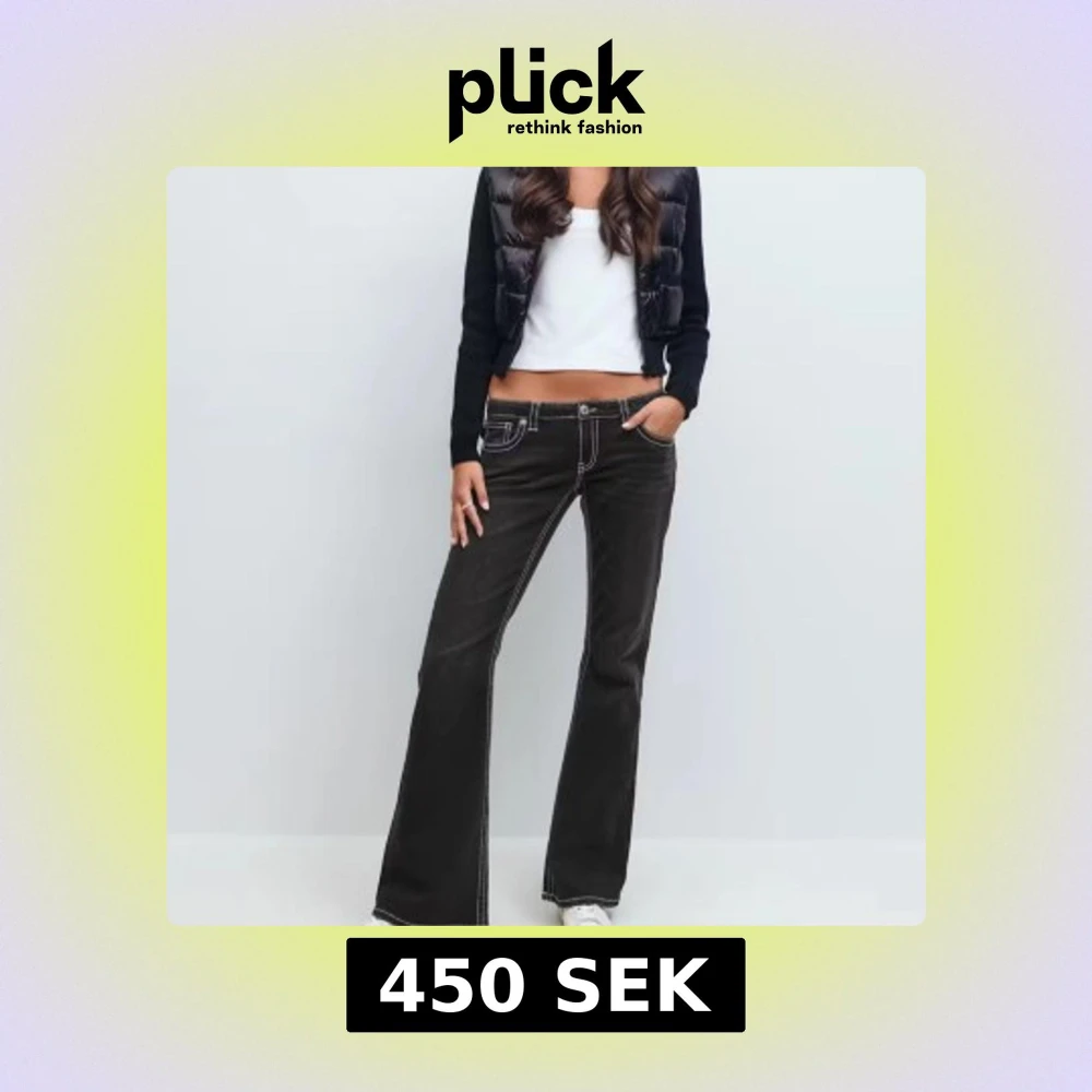 Snygga svarta jeans med vita kontrastsömmar och broderade bakfickor. Modellen är lågmidjad och har bootcut-ben som ger en retro vibe. Perfekta för dig som vill sticka ut med detaljer och cool passform. Säljer dessa snygga svarta low rise flare jeans från Gina Tricot. Endast använda 1 gång, i nyskick. Tyvärr för stora för mig, därför säljs de vidare. Pris 450, går att diskutera vid snabb affär.