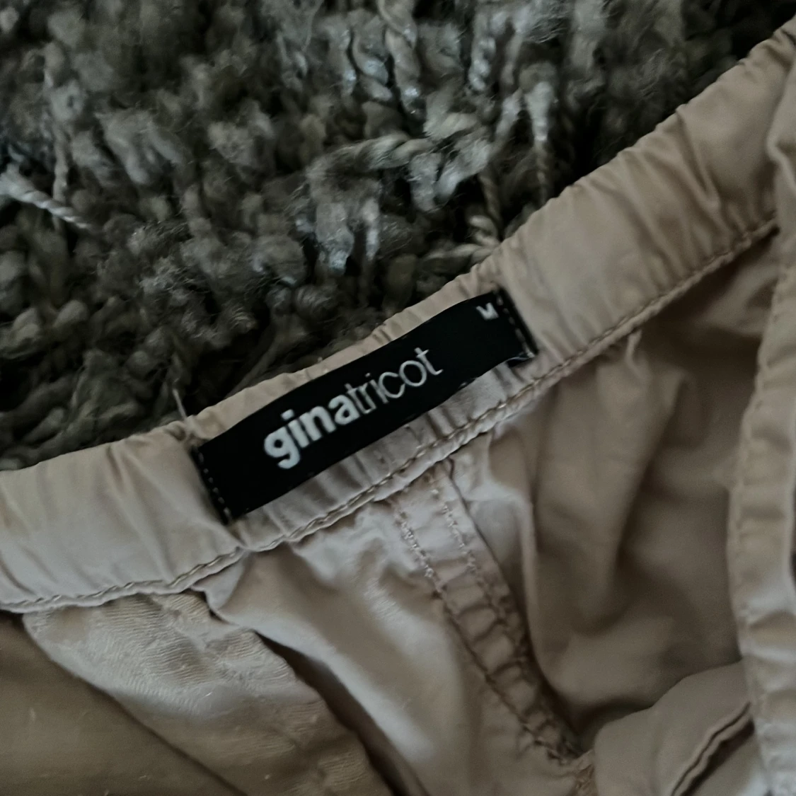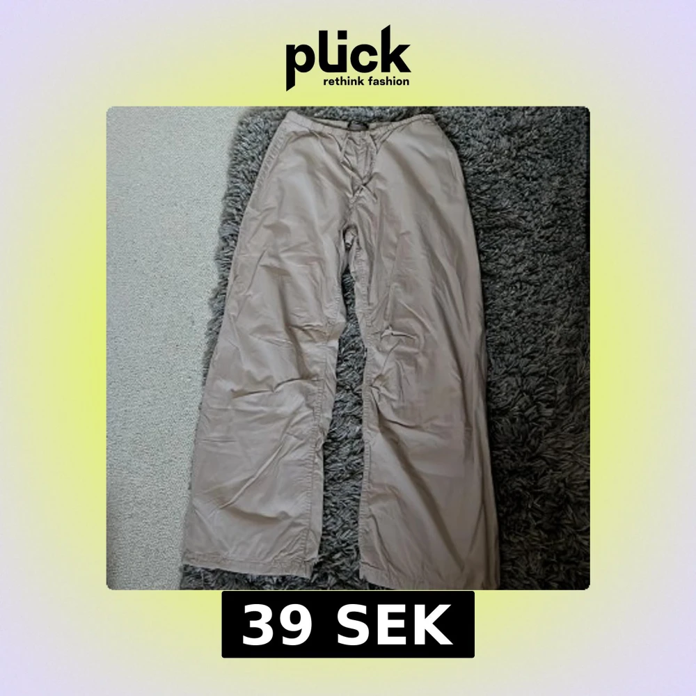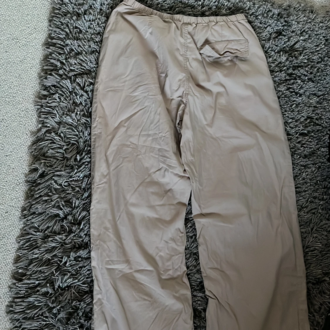 Säljer ett par beiga wide byxor från Gina Tricot i storlek M. Byxorna har resår i midjan, snörning vid benslut och en bakficka med lock. Perfekta för en chill och avslappnad stil. Materialet känns lätt och luftigt.