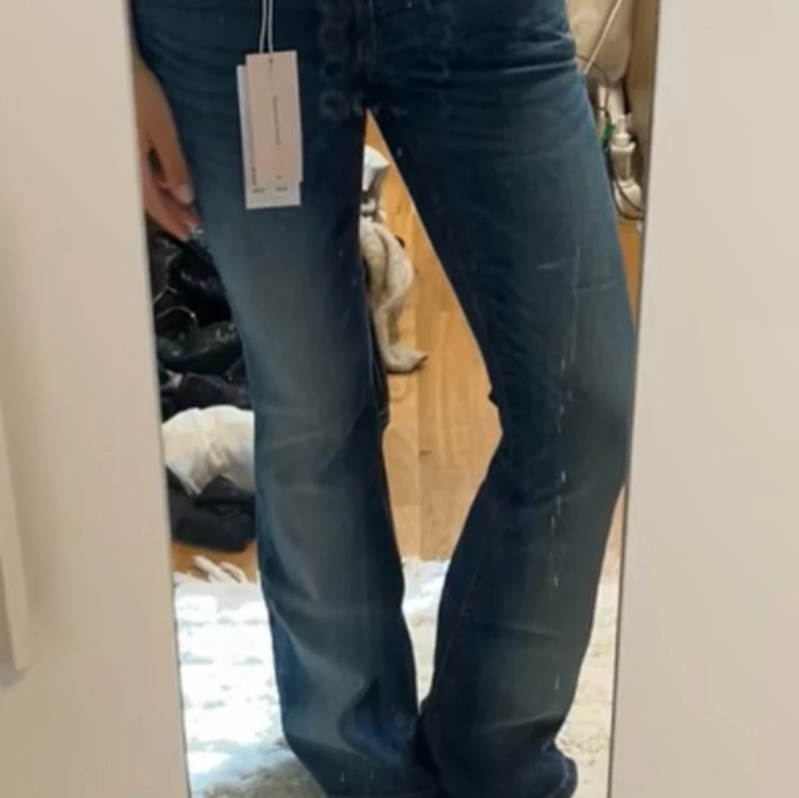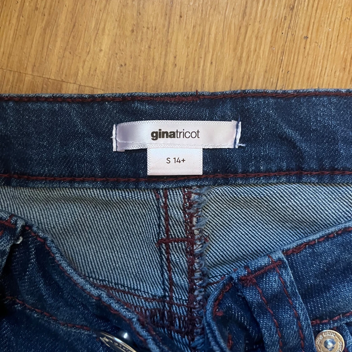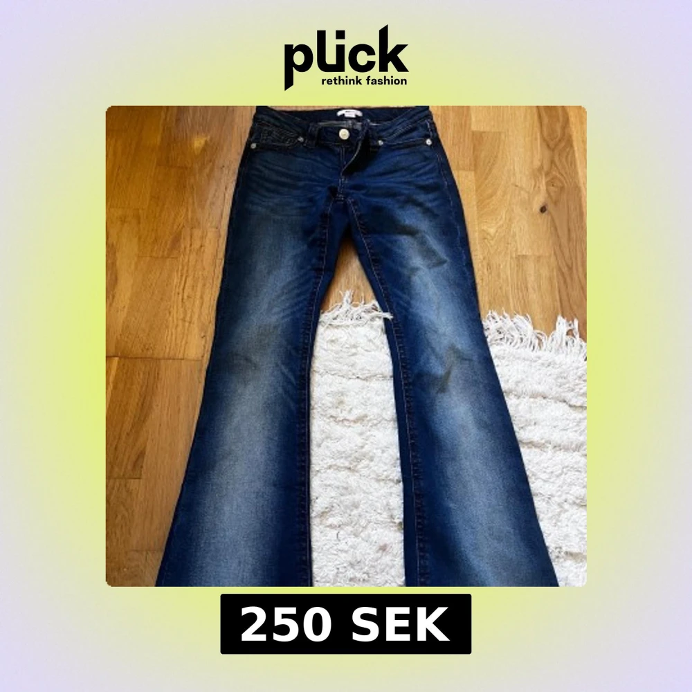Snygga mörkblå bootcut jeans från Gina Tricot med klassisk femficksdesign och lätt slitning på låren. Jeansen har normal passform och är tillverkade i stretchig denim för extra komfort. Perfekta för dig som gillar en retroinspirerad look.