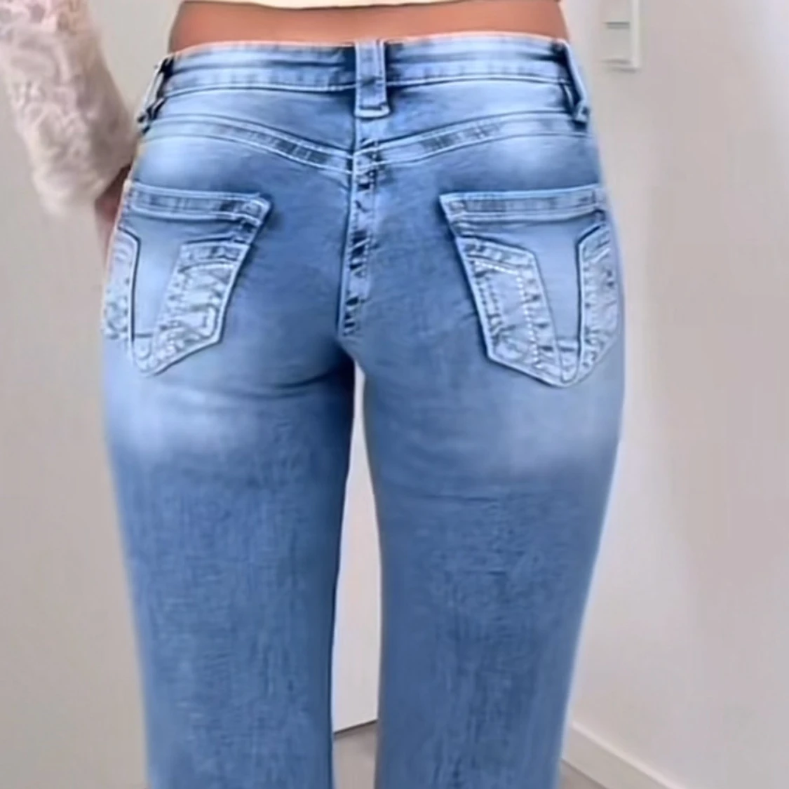 Säljer ett par ljusblå bootcut jeans med snygga bakfickor som har broderade detaljer och nitar. Jeansen har låg midja och klassisk femficksdesign. Perfekta för dig som gillar en retro vibe och vill sticka ut lite extra. Endast använt och tvättat en gång, säljer då jag vill köpa likadana fast i midre stolen