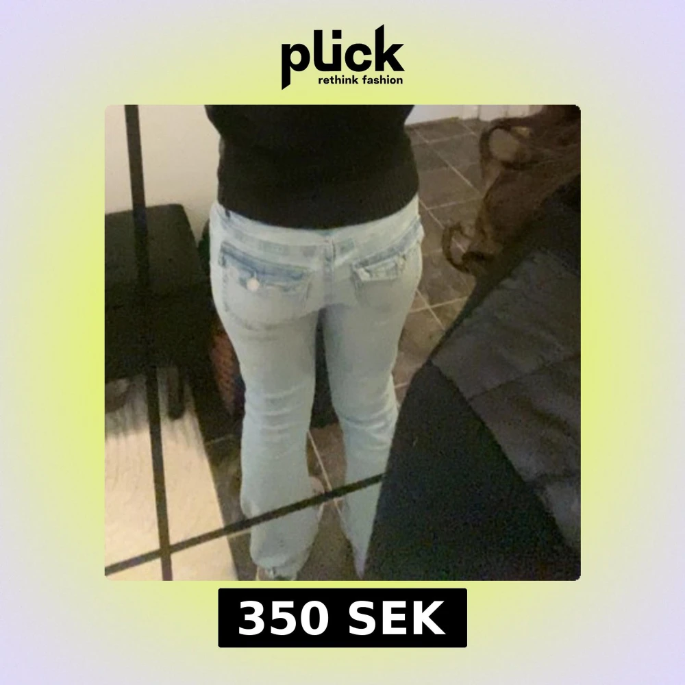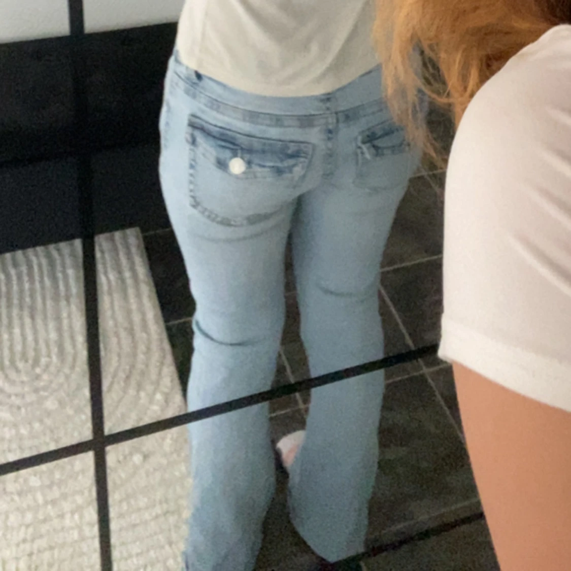 Säljer ett par ljusblå jeans med bootcut-modell och låg midja. Jeansen har klassiska fickor bak med lock och knappdetaljer. De är jätte low waist och sitter jätte snyggt på mig som har storlek S i byxor. Säljer då jag har för många jeans