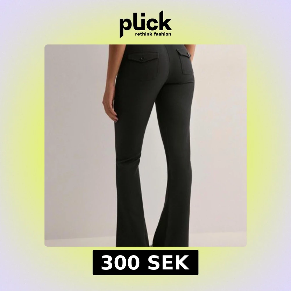 Snygga svarta bootcut byxor med hög midja och två bakfickor med lock och knapp. Byxorna har en klassisk siluett med utsvängda ben och stängs med knapp och dragkedja framtill. Perfekta för dig som gillar en stilren look.