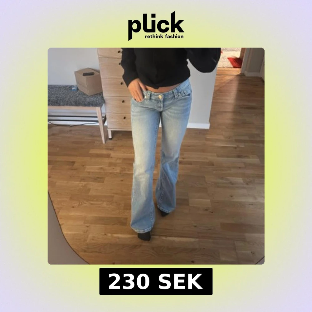 Säljer ett par ljusblå bootcut jeans med låg midja och snygg broderad detalj på bakfickan. Jeansen är från Gina 14+🥰
