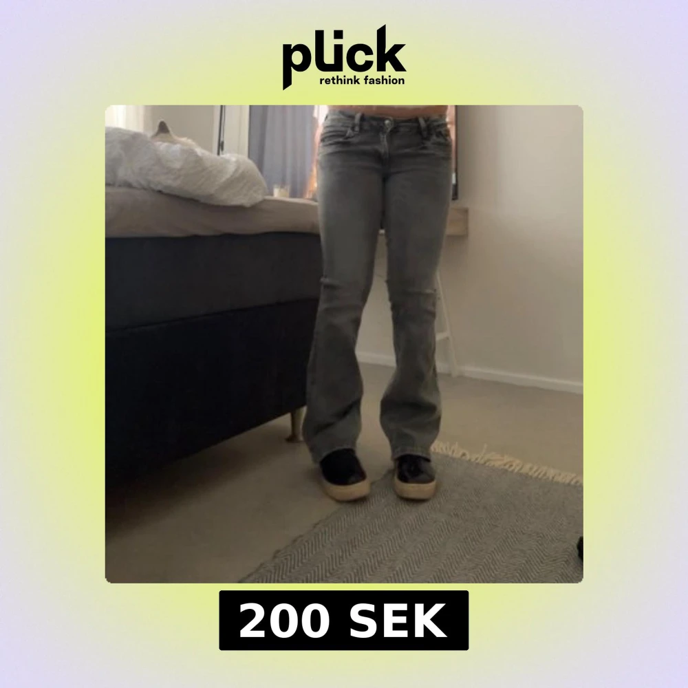 Säljer ett par grå jeans med bootcut-modell och låg midja. Jeansen har klassiska fem fickor, dragkedja och knapp framtill. Snygg tvätt och skön passform som ger en retrovibe. Perfekta till sneakers eller boots.
