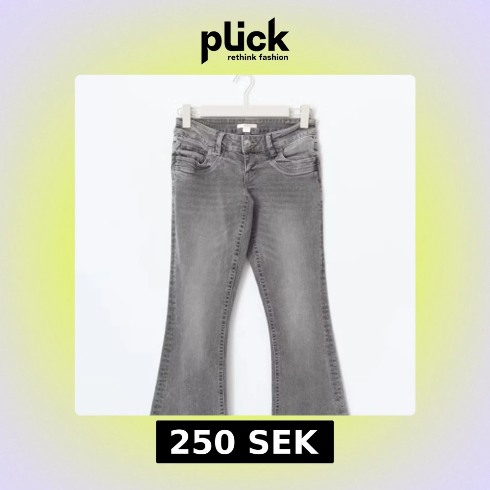 Säljer ett par grå bootcut jeans från Gina Tricot. Jeansen är i storlek S från ginas 14+ avdelning,de har låg midja och snygg tvättad finish. Materialet är mjukt denim som sitter skönt.