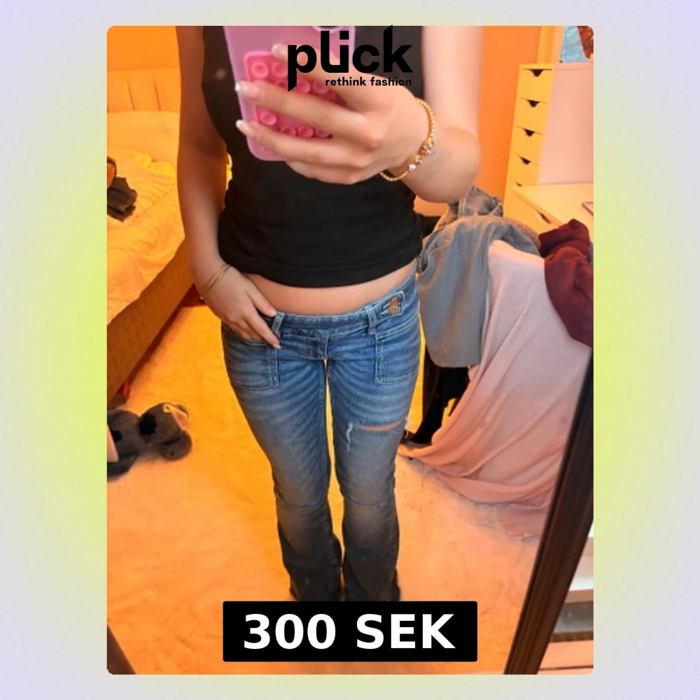 Snygga blå bootcut jeans från Gina Tricot med låg midja och slitna detaljer på benen. Är i bra skick förutom att det är avklippta längst ner, så skulle säga att de passar nån som är 155 och neråt. Pris kan diskuteras. Bara att skriva om ni har några frågor eller har några funderingar! Mvh Amanda❣️