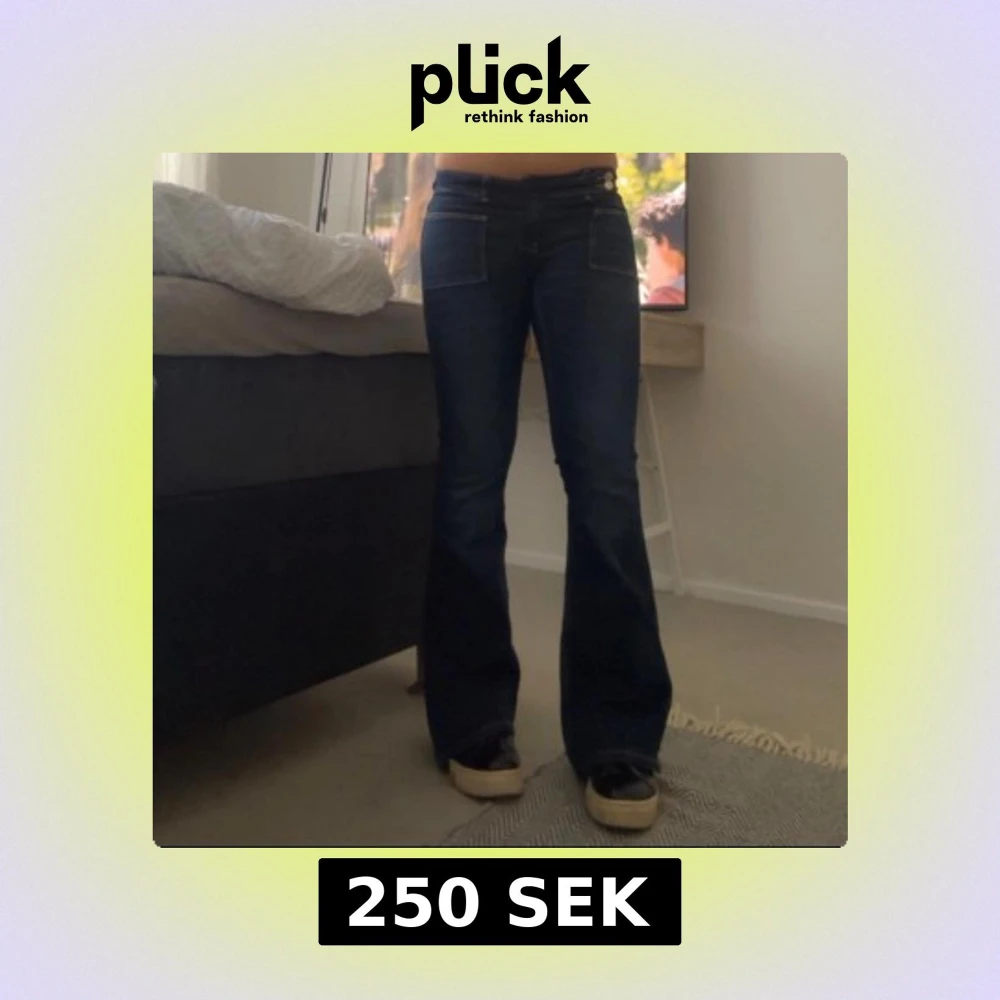 Säljer ett par mörkblå jeans med bootcut-modell och stora fickor fram. Jeansen har hög midja och klassisk femficksdesign. Snygg passform som sitter tajt upptill och släpper ut vid benen. Perfekta för dig som gillar retrovibbar och vill ha en cool siluett.